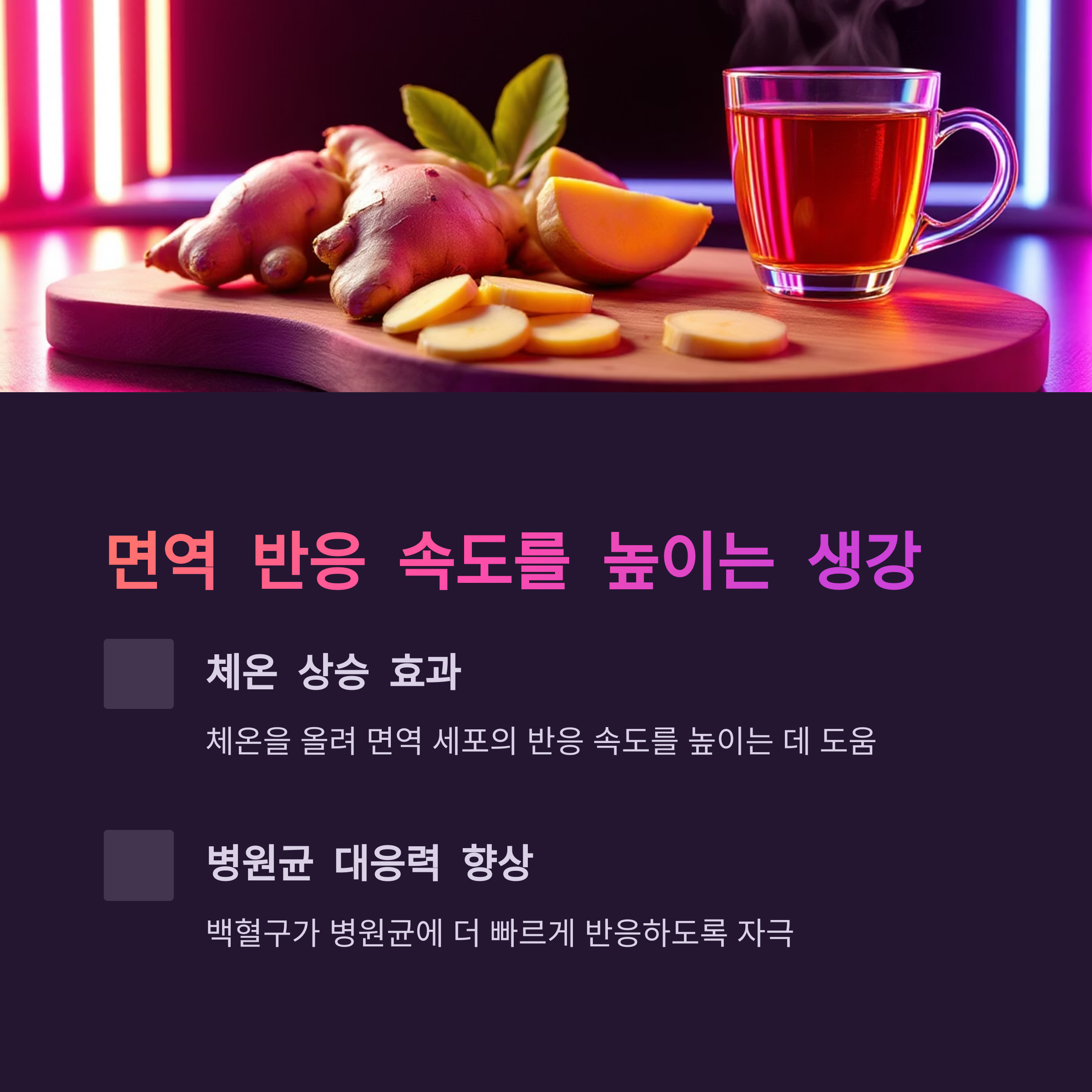 생강은 체온을 올려 면역 세포의 반응 속도를 높이는 데 도움을 줍니다.