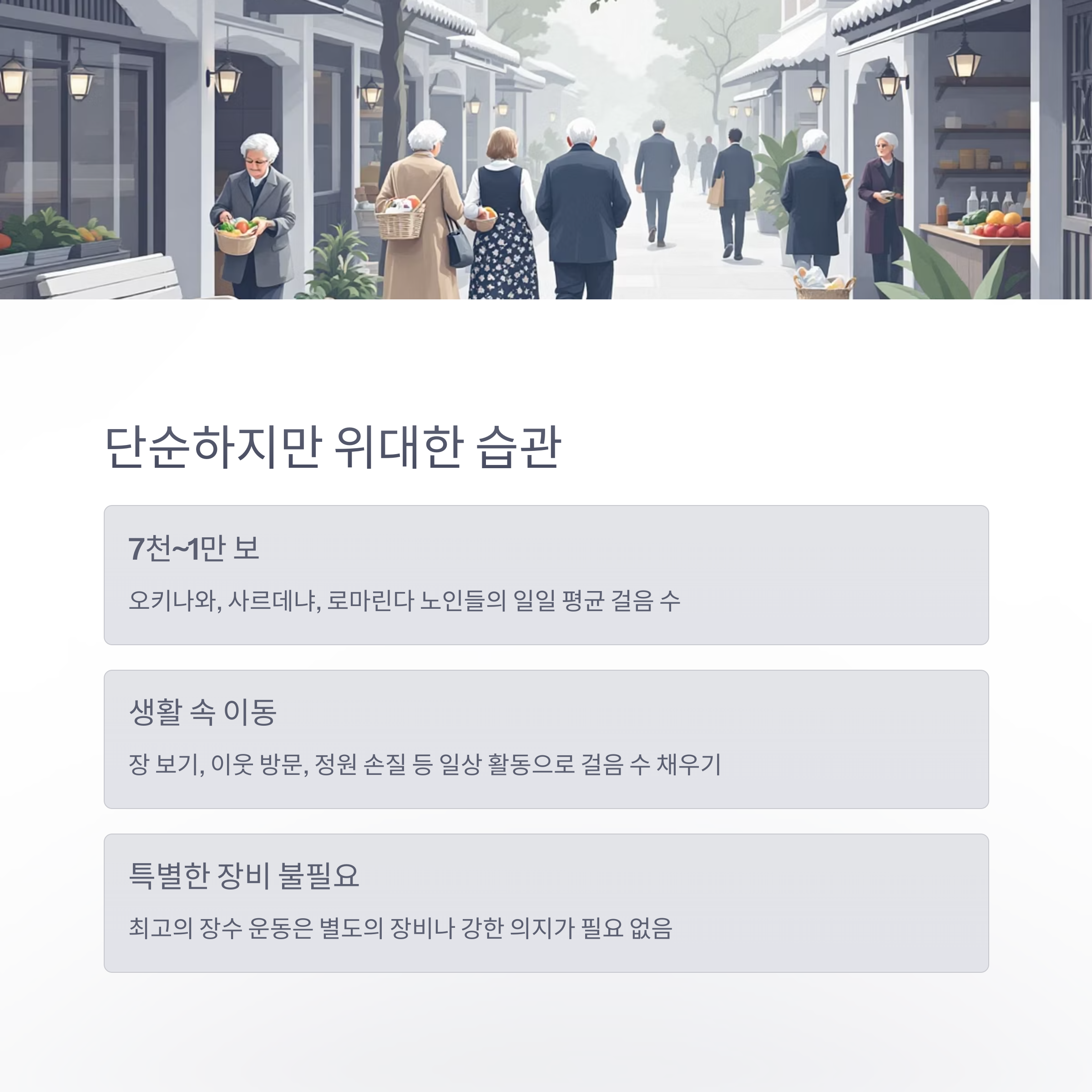전 세계 장수마을 노인들의 공통된 일상 속에는 '걷기'라는 평범하지만 강력한 행동이 숨어 있습니다.