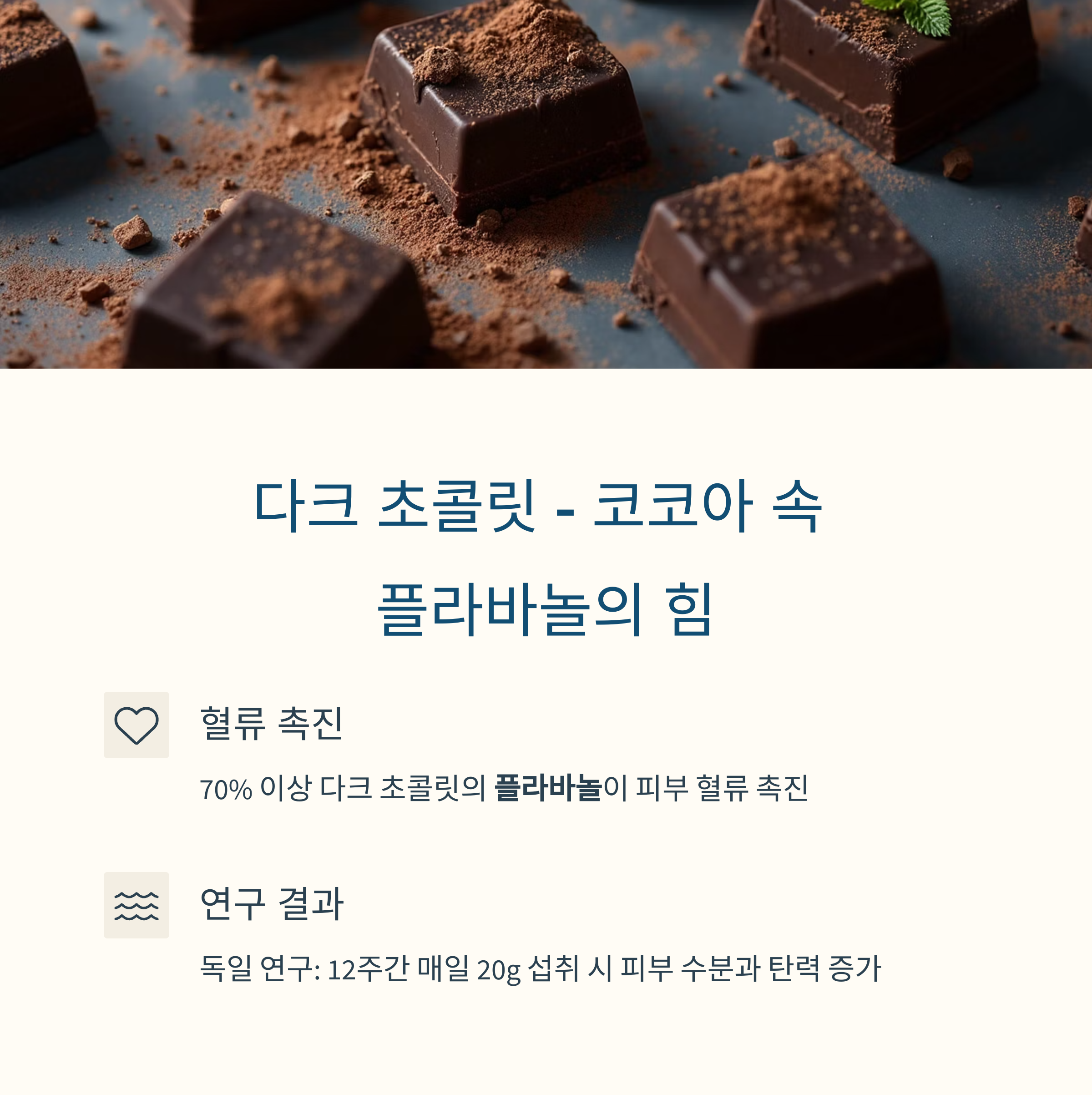 | 플라바놀 | 다크 초콜릿 | 수분 유지, 피부 탄력 향상 |