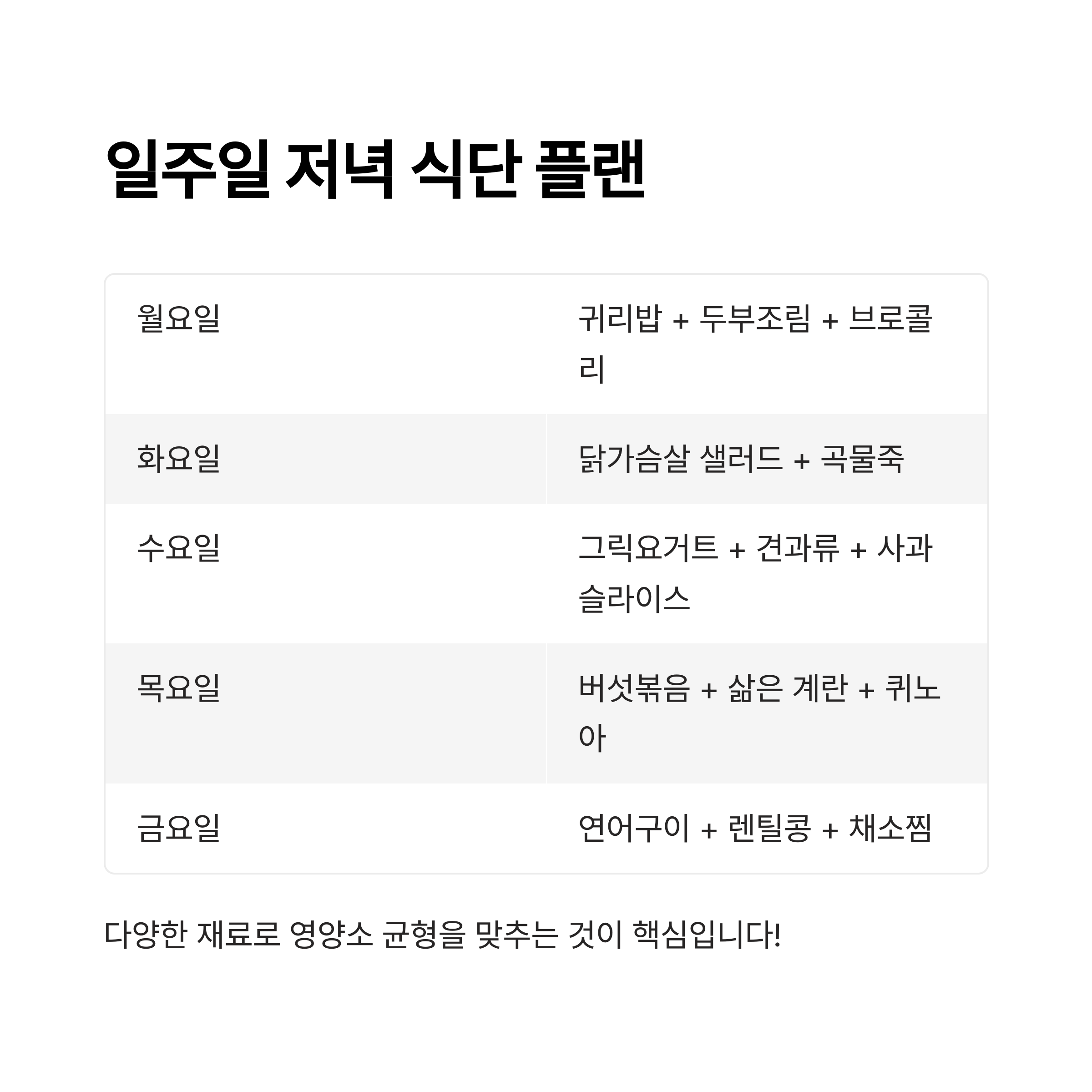 다양한 재료를 번갈아 섭취하며 영양소의 균형을 맞추는 것이 중요합니다.