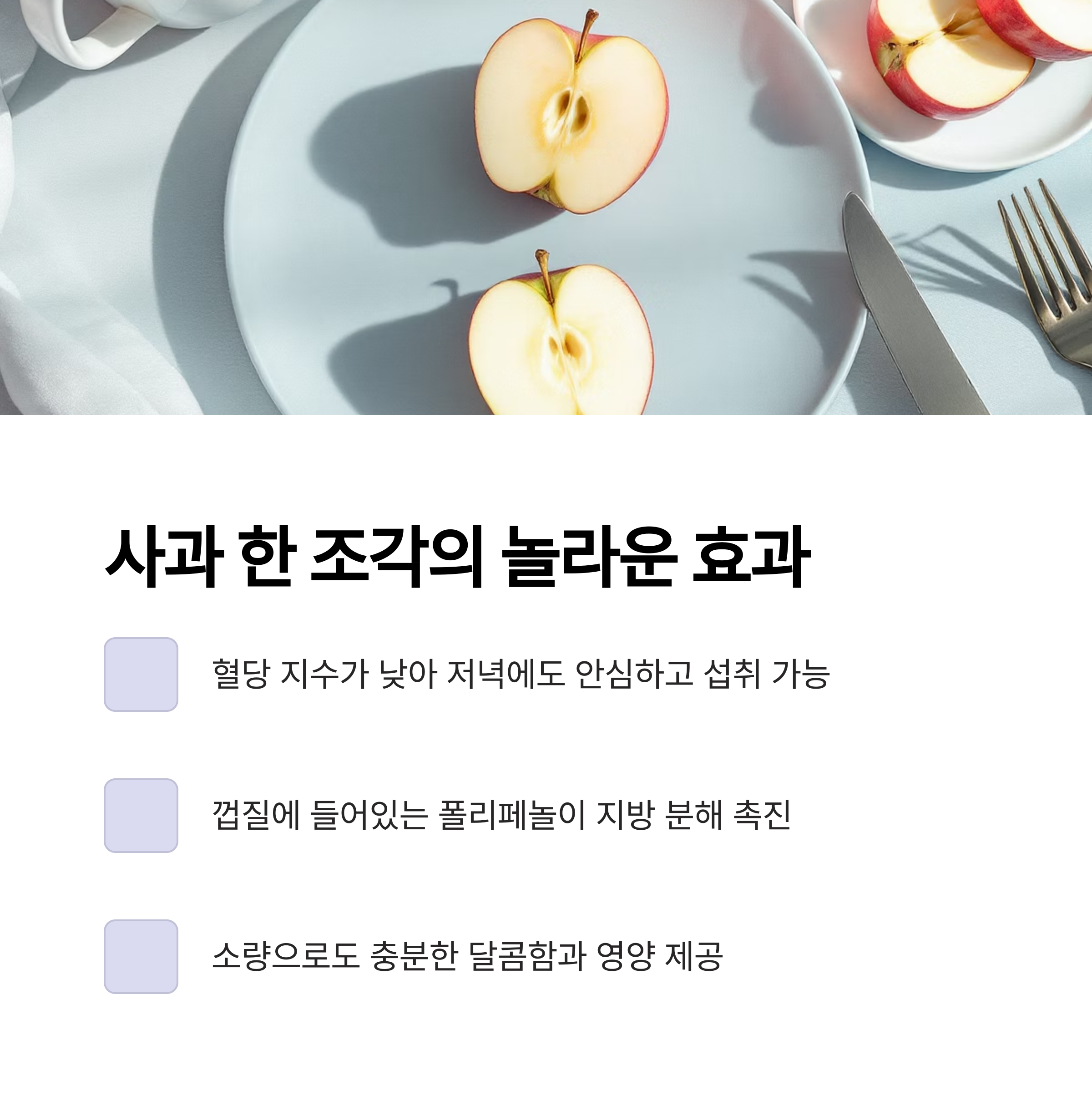 사과는 혈당 지수가 낮아 저녁에 소량 섭취해도 부담이 없습니다.