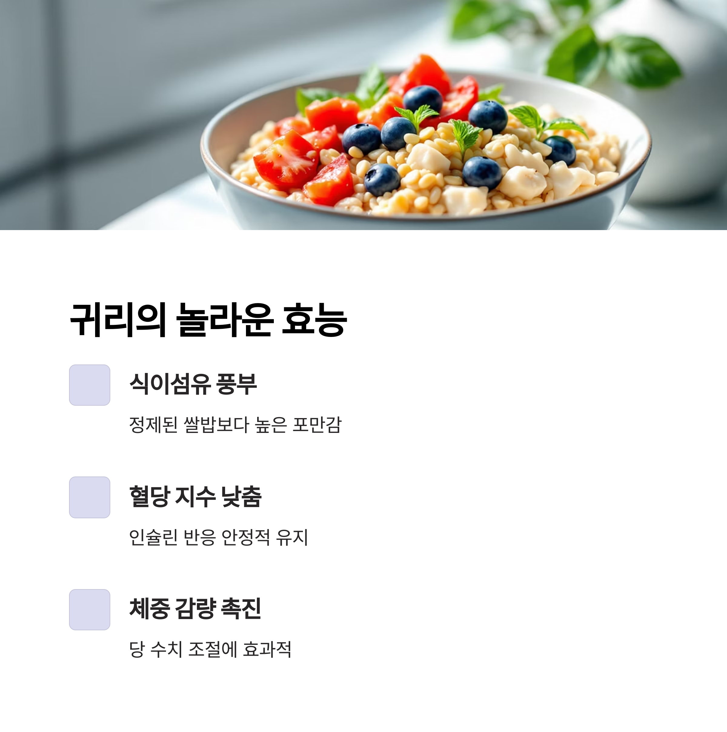 | 귀리 | 식이섬유 풍부, 혈당 조절 |