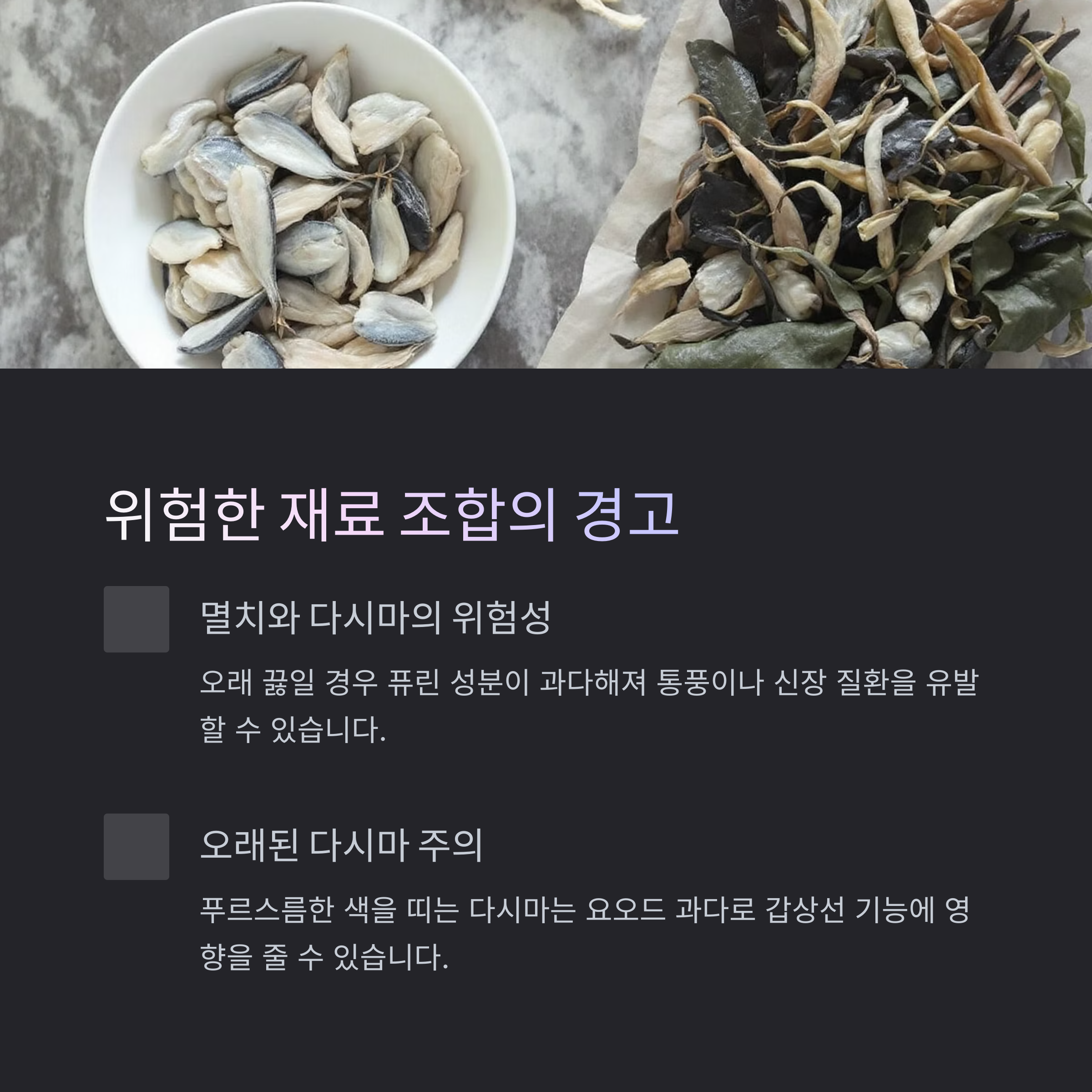 오래 끓일 경우 퓨린 성분이 과다해져 통풍이나 신장 질환을 유발할 수