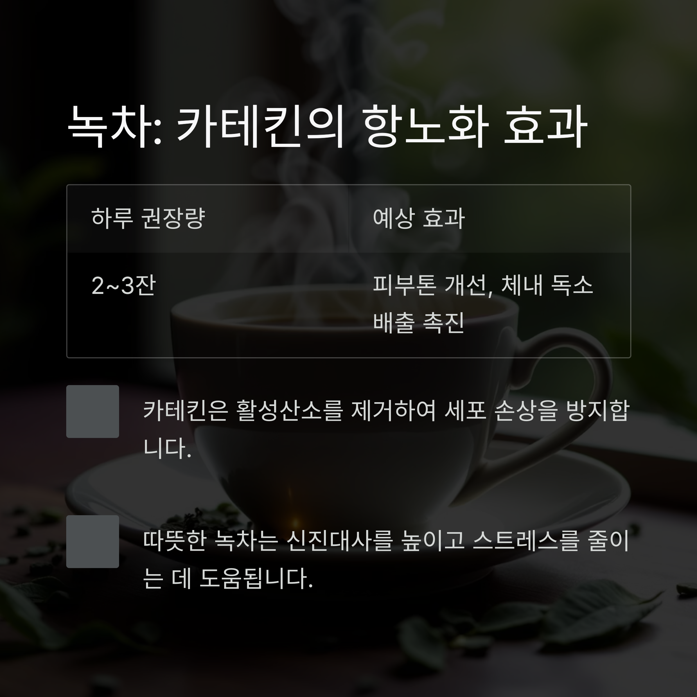녹차에는 카테킨이라는 강력한 항산화제가 있어 피부 노화를 막고