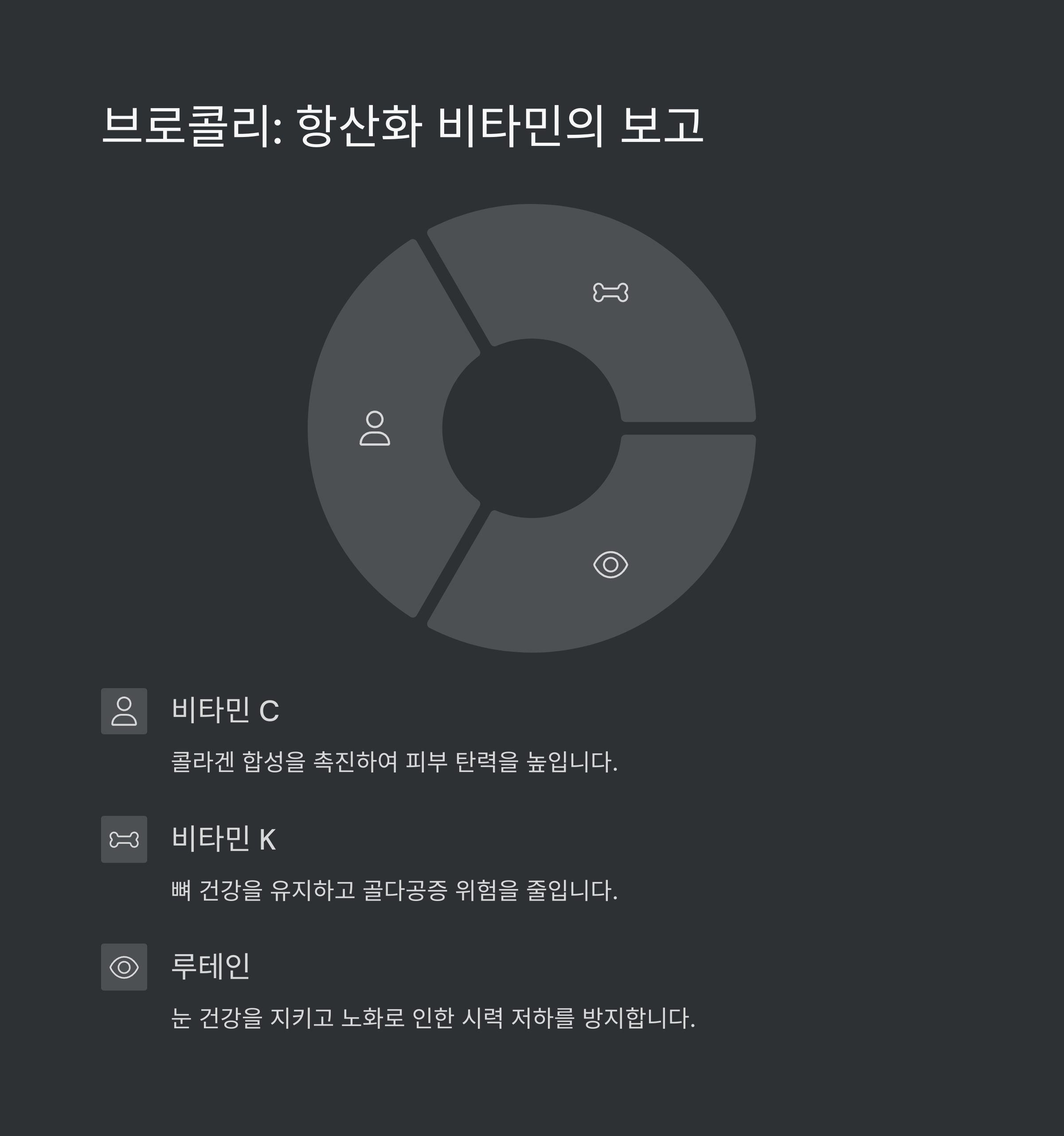 브로콜리는 비타민 C, K, 그리고 루테인 등의 항산화 물질이 풍부하여