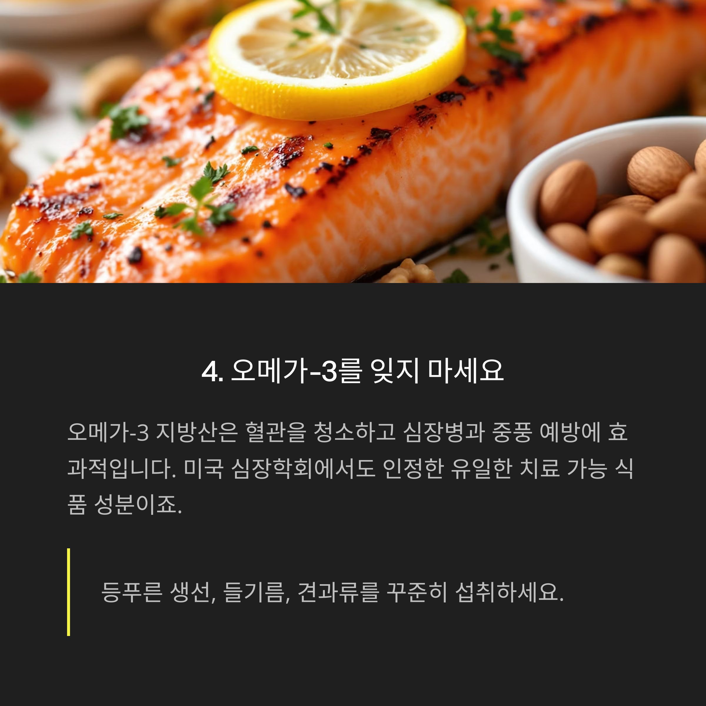 생선 외에도 들기름, 호두, 아몬드 등 견과류에도 풍부하니 꾸준히 섭취하세요.
