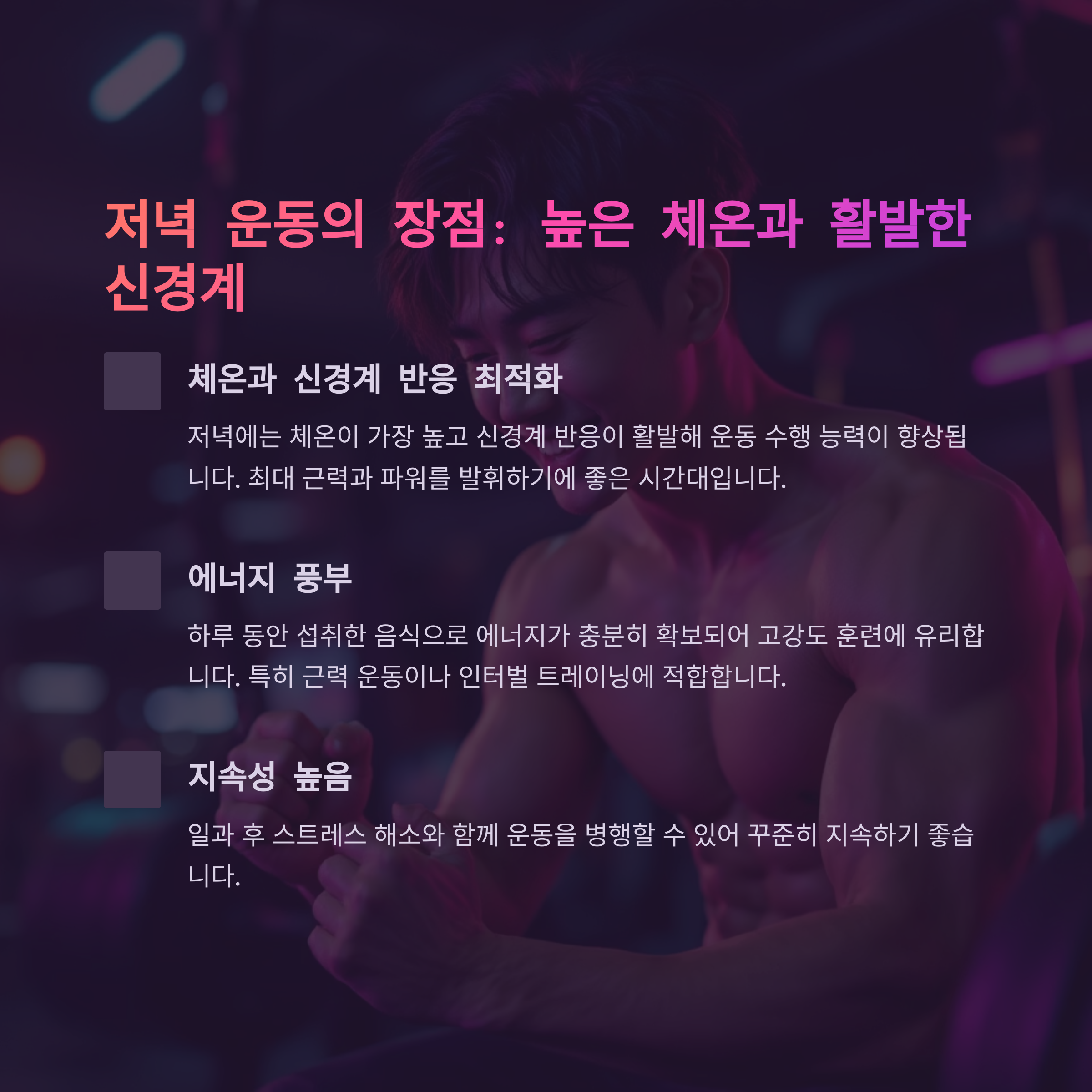 근력 향상과 체력 강화를 목표로 한다면 저녁 운동이 적합하다는 점을 기억하세요.