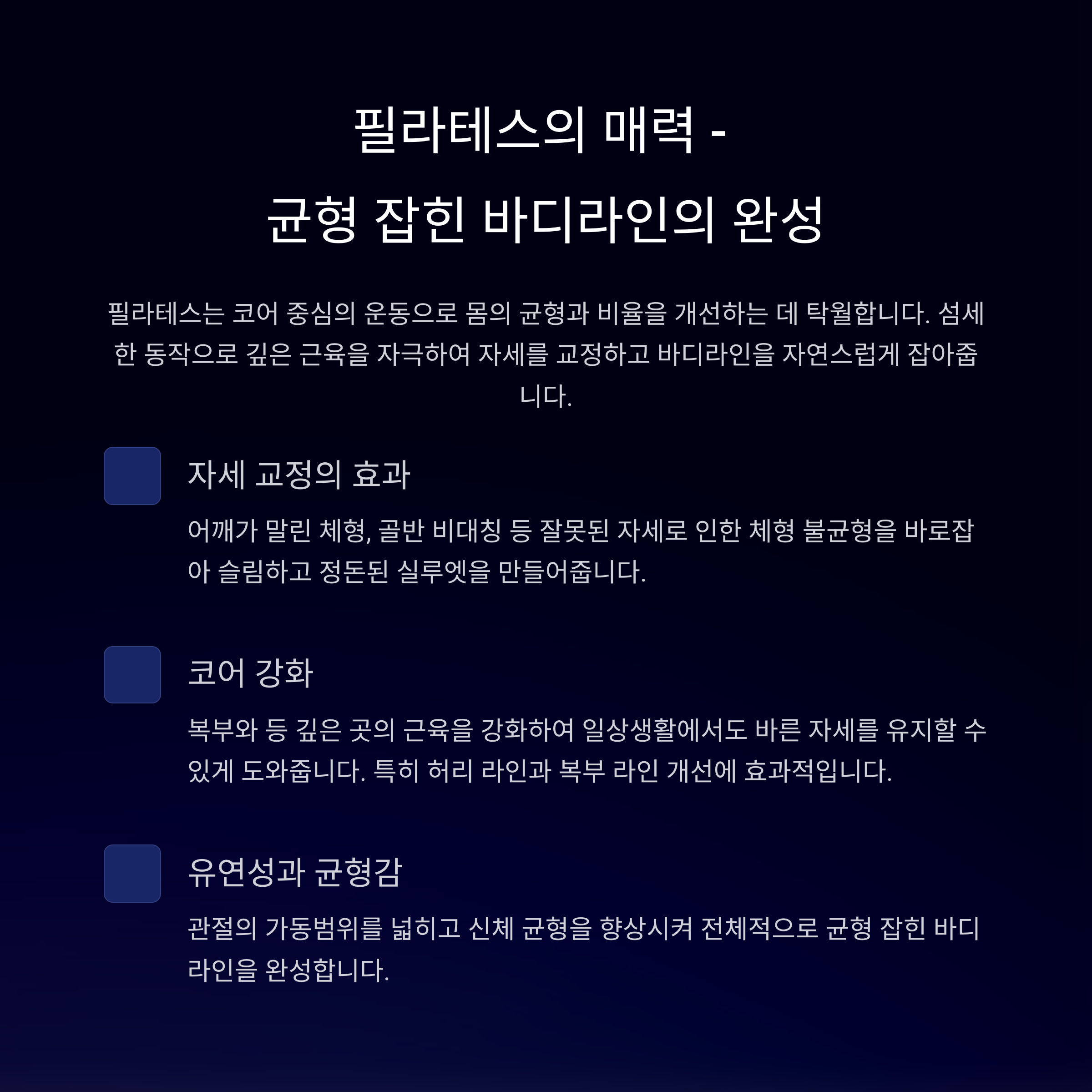 필라테스는 코어 중심의 근육을 강화하고 자세를 교정해