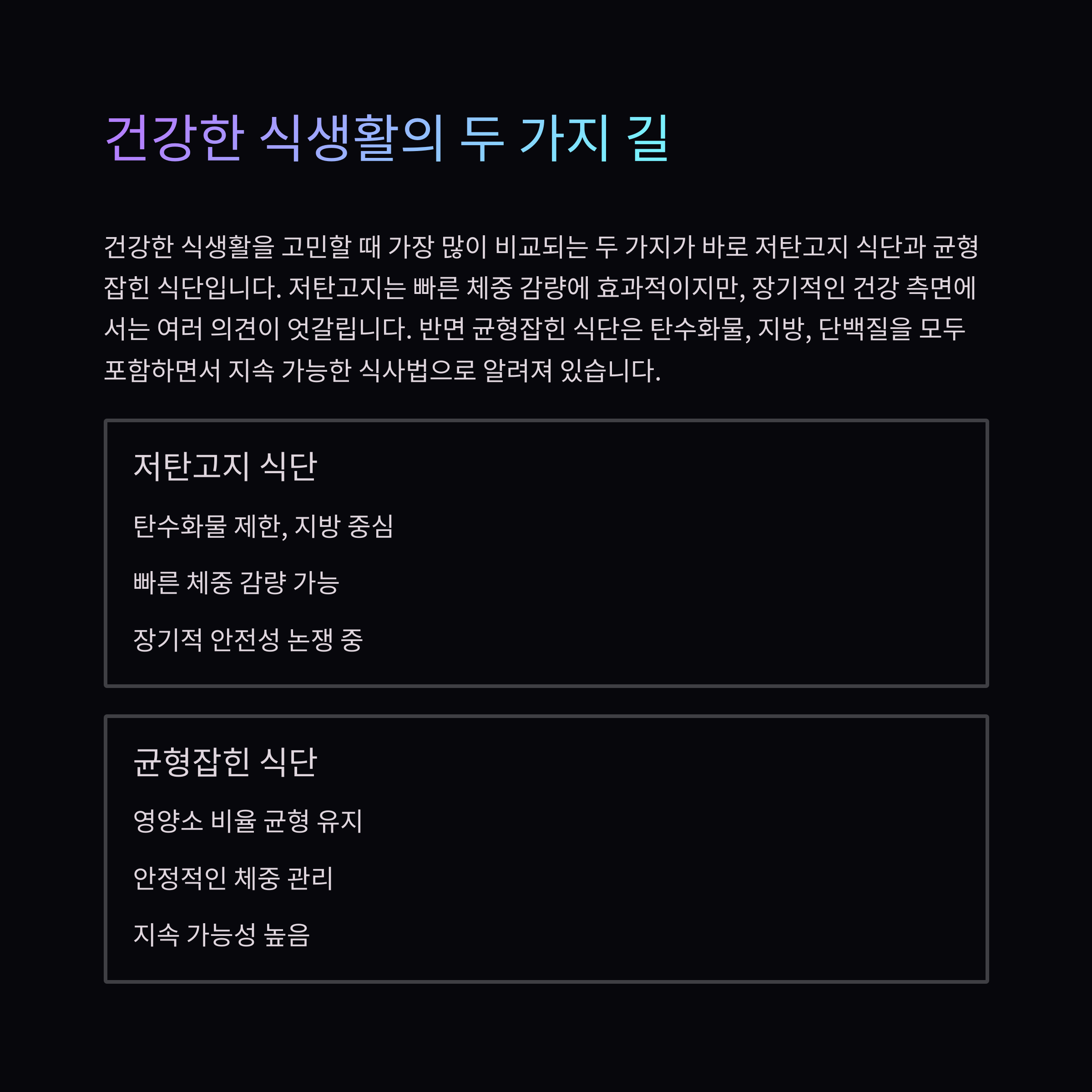 건강한 식생활을 고민할 때 가장 많이 비교되는 두 가지가 바로 저탄고지 식단과 균형잡힌 식단입니다. 저탄고지는 빠른 체중 감량에 효과적이지만, 장기적인 건강 측면에서는 여러 의견이 엇갈립니다. 반면 균형잡힌 식단은 탄수화물, 지방, 단백질을 모두 포함하면서 지속 가능한 식사법으로 알려져 있습니다. 이 글에서는 두 식단의 장단점을 비교하며, 장기적으로 어떤 식단이 더 건강한 선택이 될 수 있는지 살펴보겠습니다.