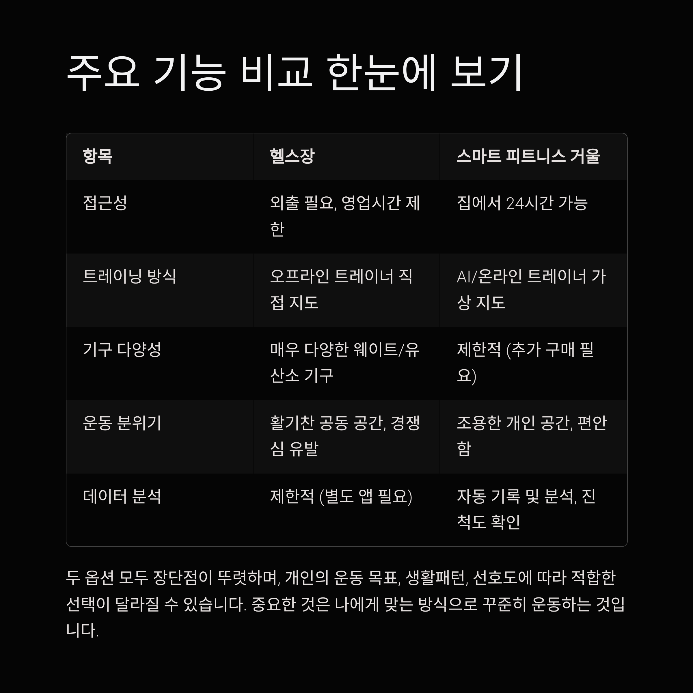 헬스장은 기구 종류가 다양하고, 전문 트레이너의 피드백을 바로 받을 수 있습니다.