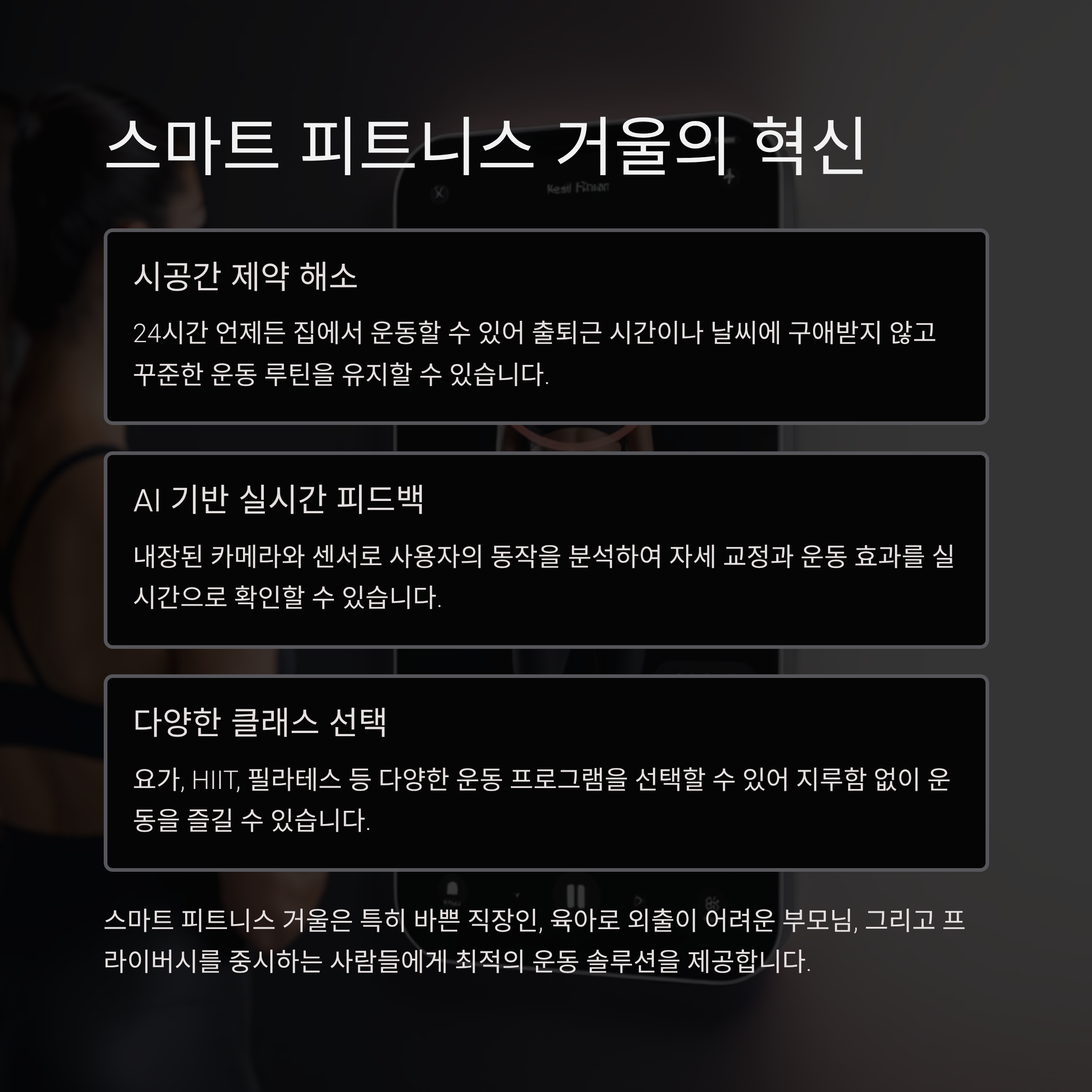 스마트 피트니스 거울의 핵심입니다. 특히 시간과 장소의 제약 없이 운동할 수 있어