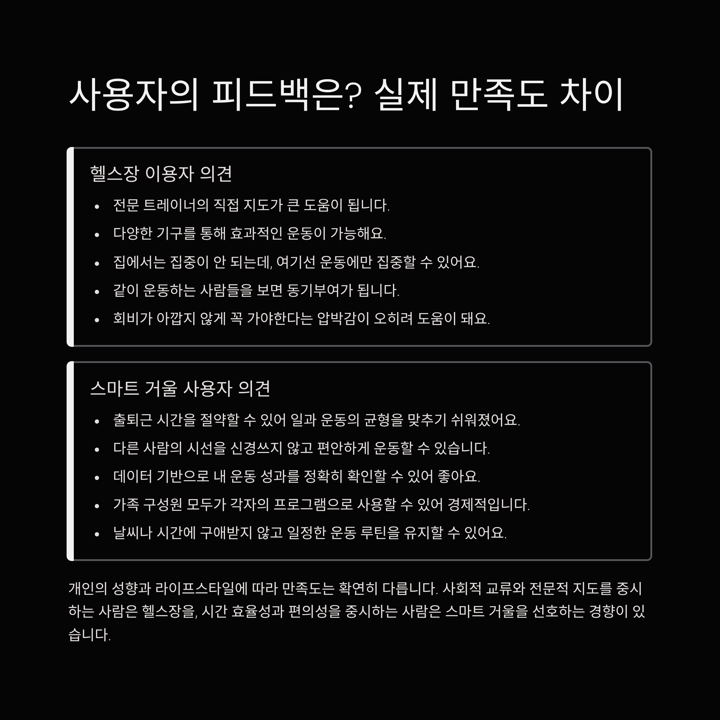 반면 스마트 피트니스 거울 사용자들은 "시간 절약", "비용 효율"을 높이 평가합니다.
