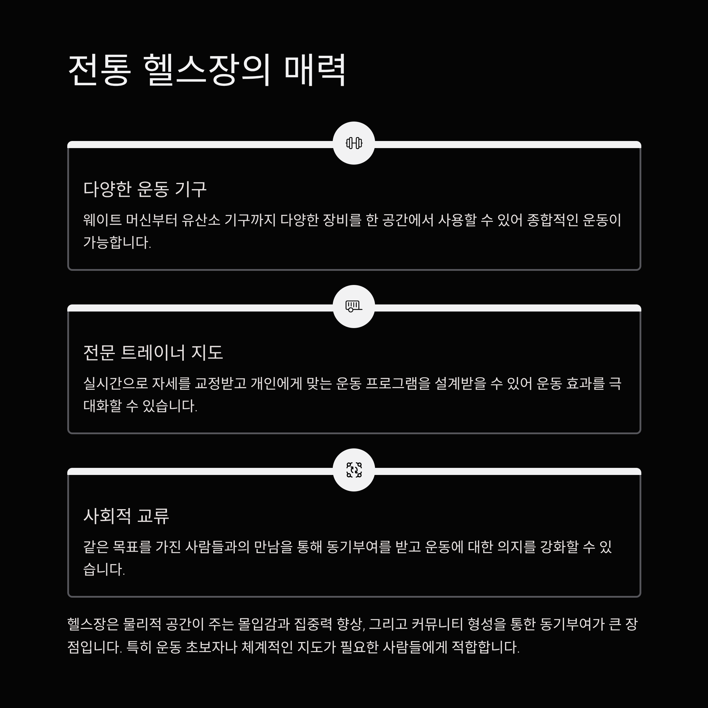 또한 커뮤니티 형성과 사교적인 요소도 많은 사람들이 헬스장을 찾는 이유입니다.