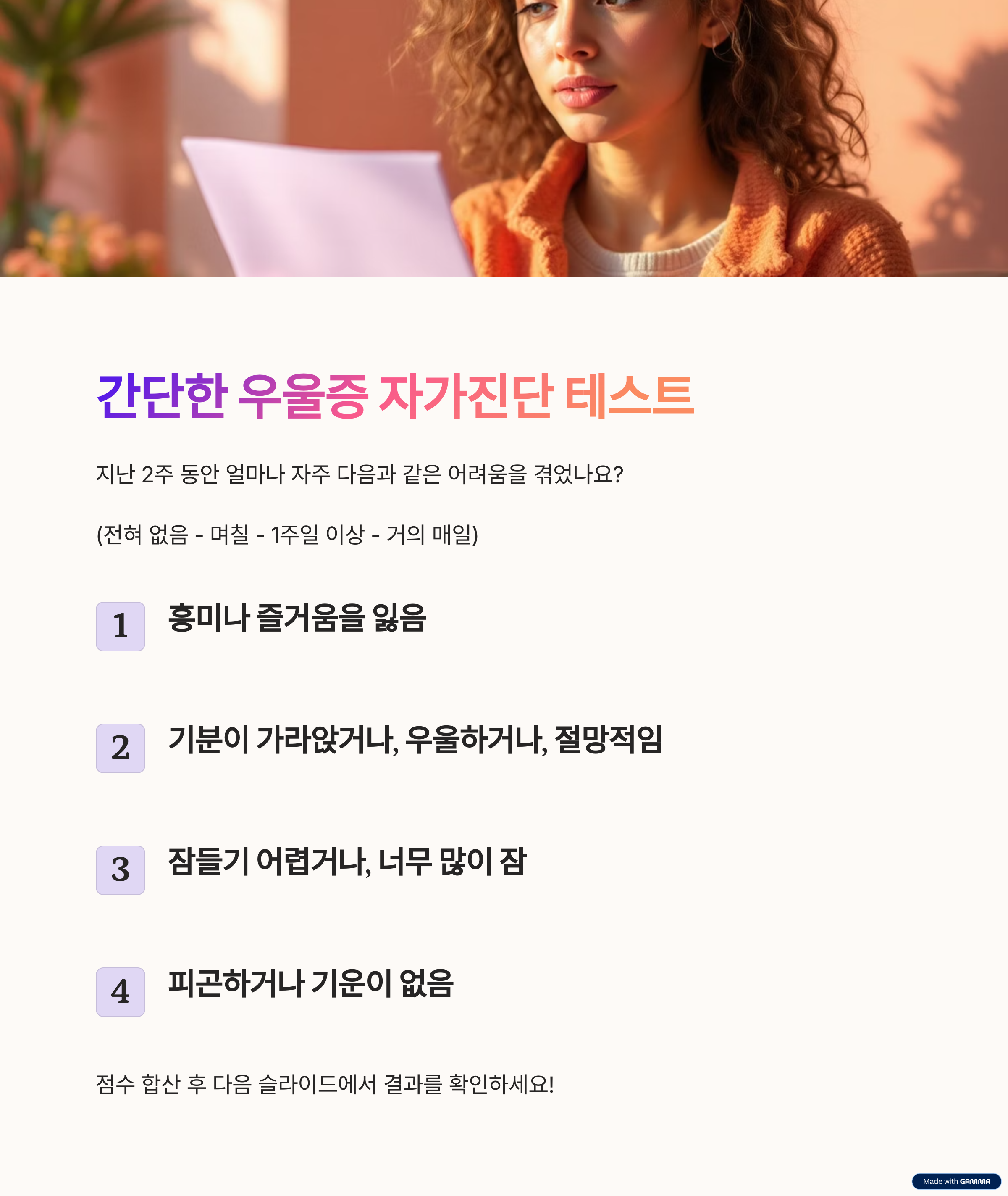 작은 징후를 놓치지 않고 조기에 대응하면, 깊은 우울로 진행되는 것을 막을 수 있습니다.