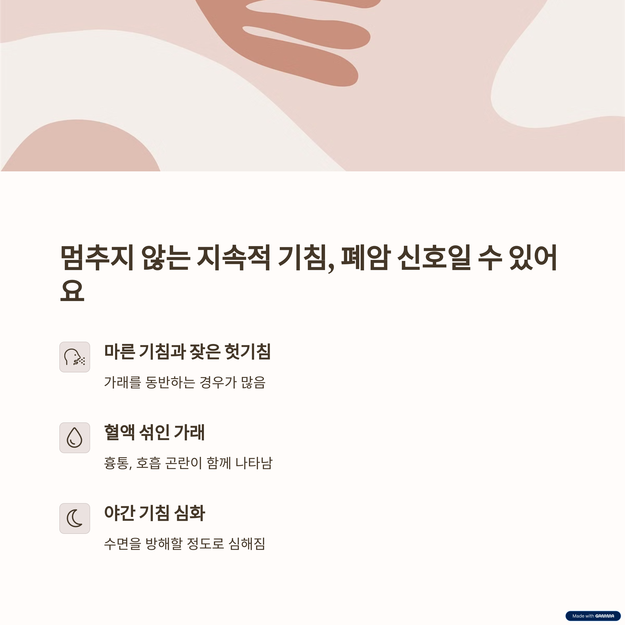 폐암은 초기에 특별한 통증 없이 기침만으로 시작되는 경우가 많습니다.