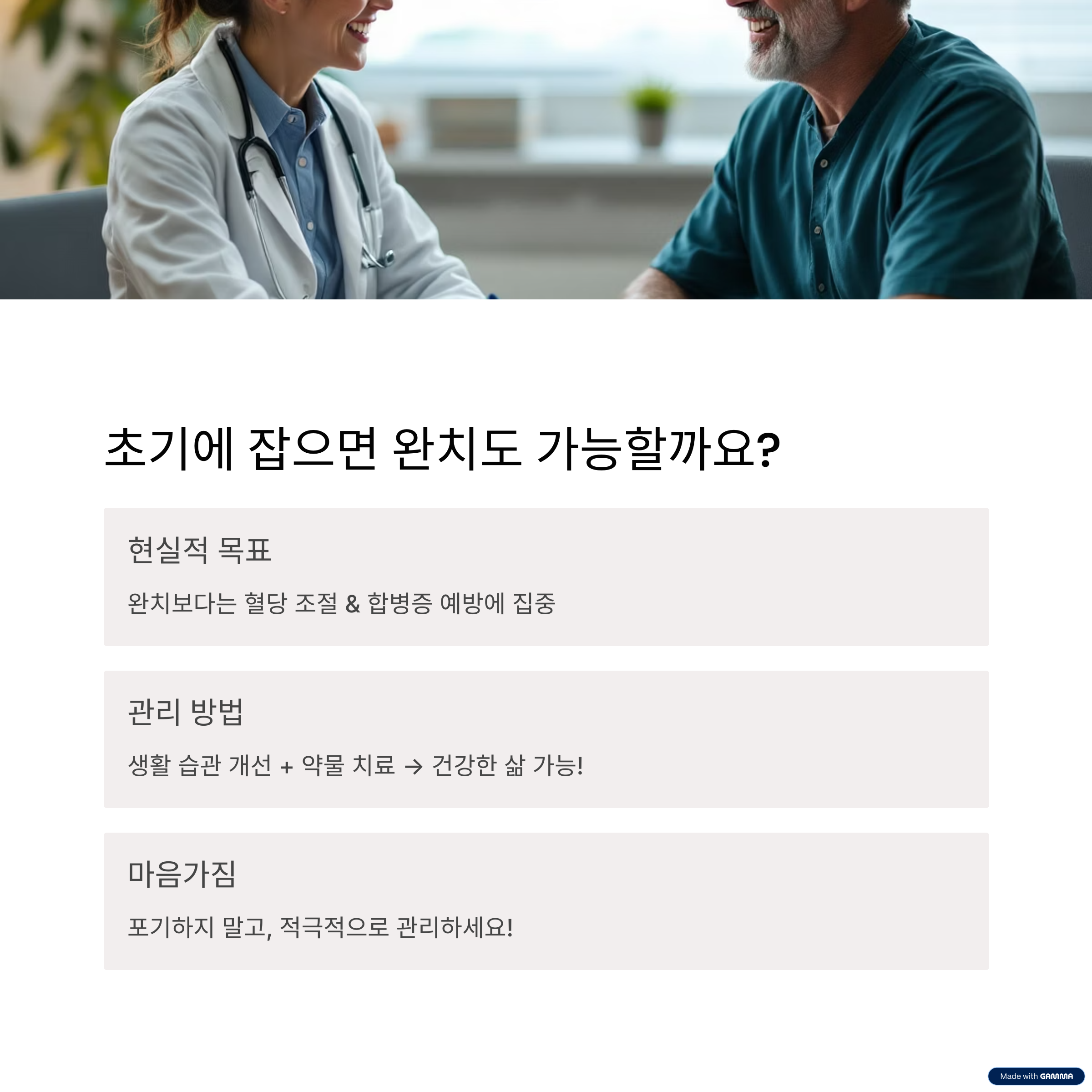 하지만 초기 단계에서는 철저한 식습관 개선과 운동, 체중 관리로 정상 혈당을 회복할 수 있습니다.