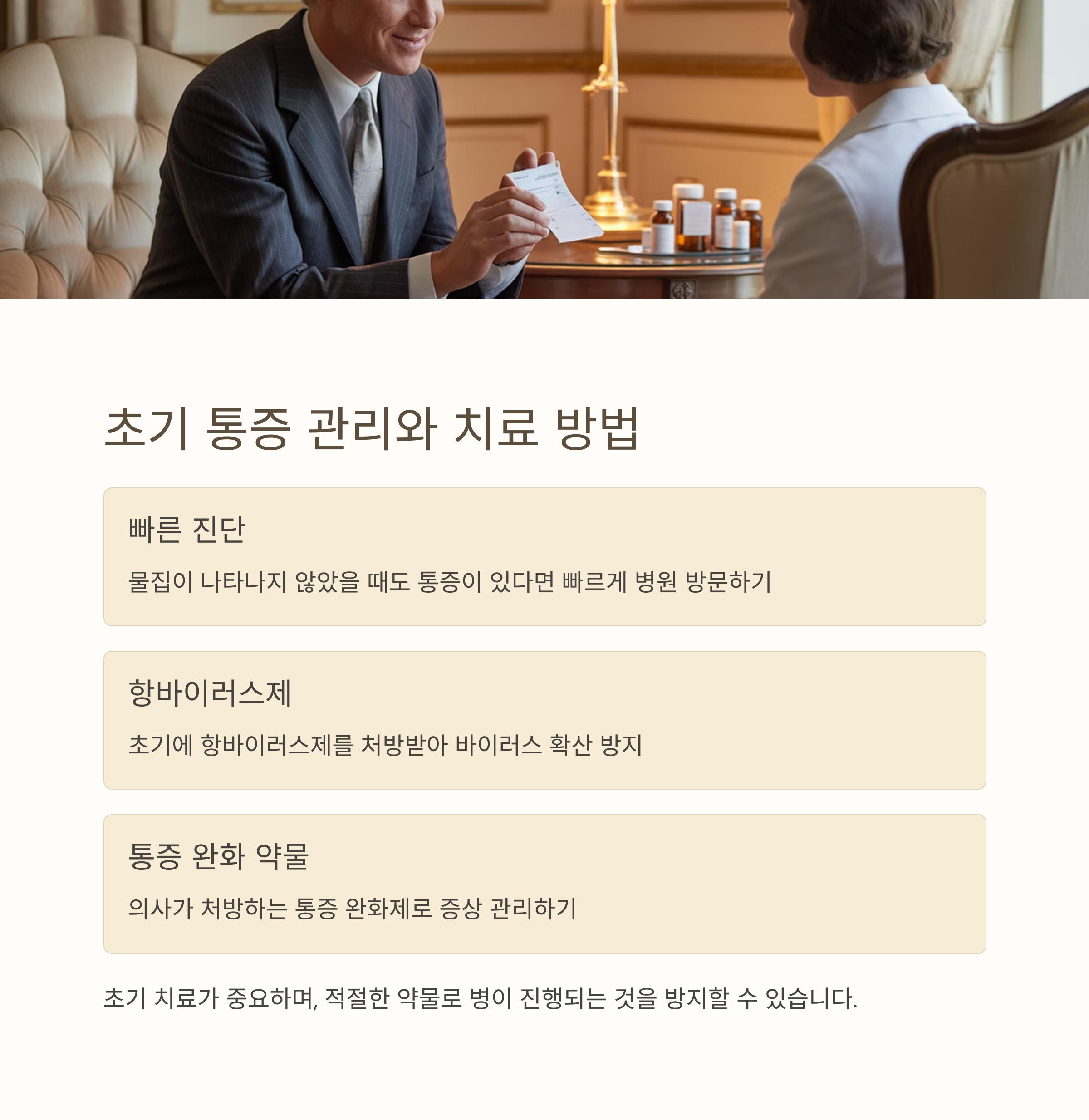 필수적으로 항바이러스제를 처방받고, 통증을 완화하는 약물 치료를 받는 것이 필요합니다. 초기 치료가 중요하며, 적절한 약물로 병이 진행되는 것을 방지할 수 있습니다.