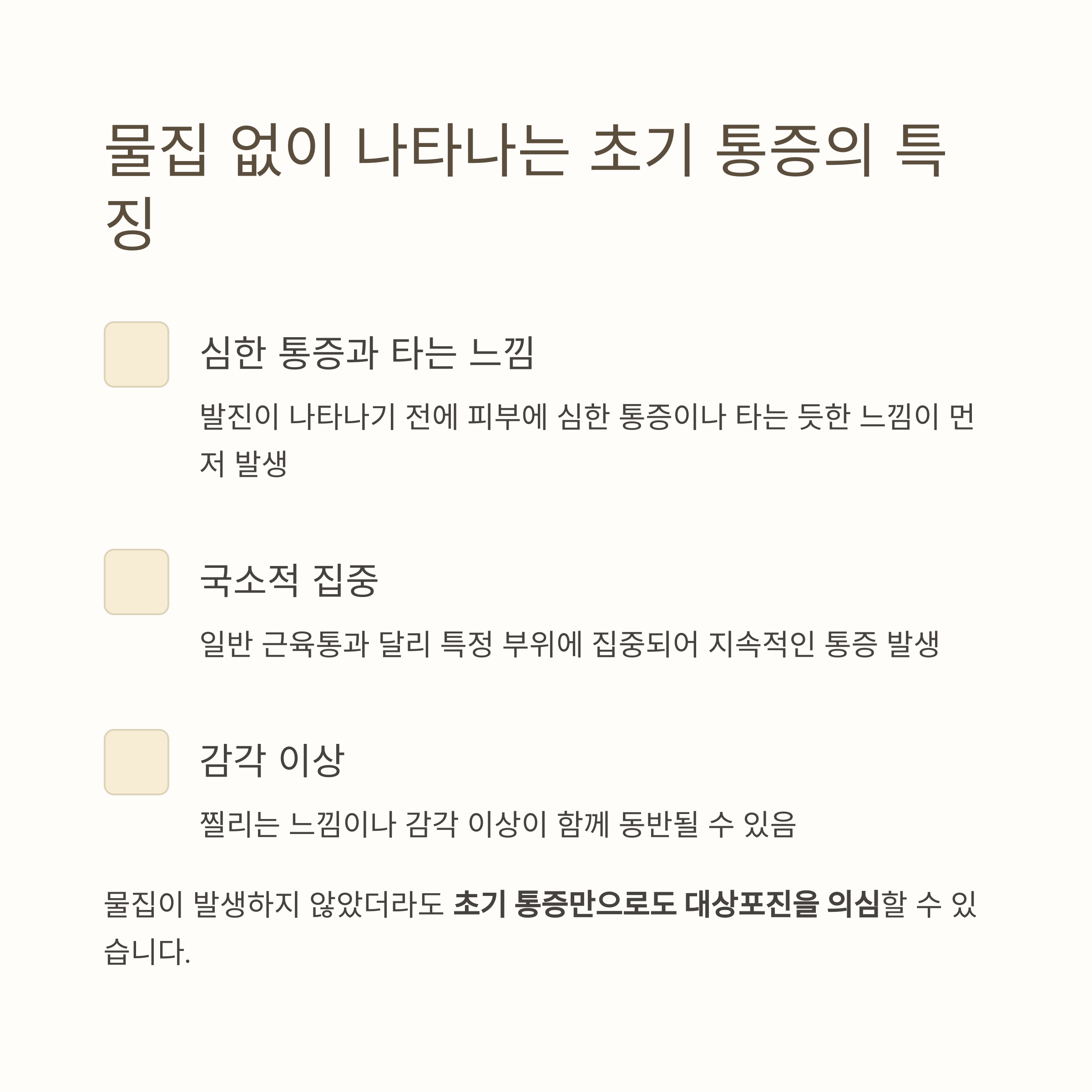 핵심적으로 발진이 나타나기 전에 통증을 느끼는 것이 가장 큰 특징이며, 이는 병의 진행을 늦추는 중요한 신호가 될 수 있습니다.