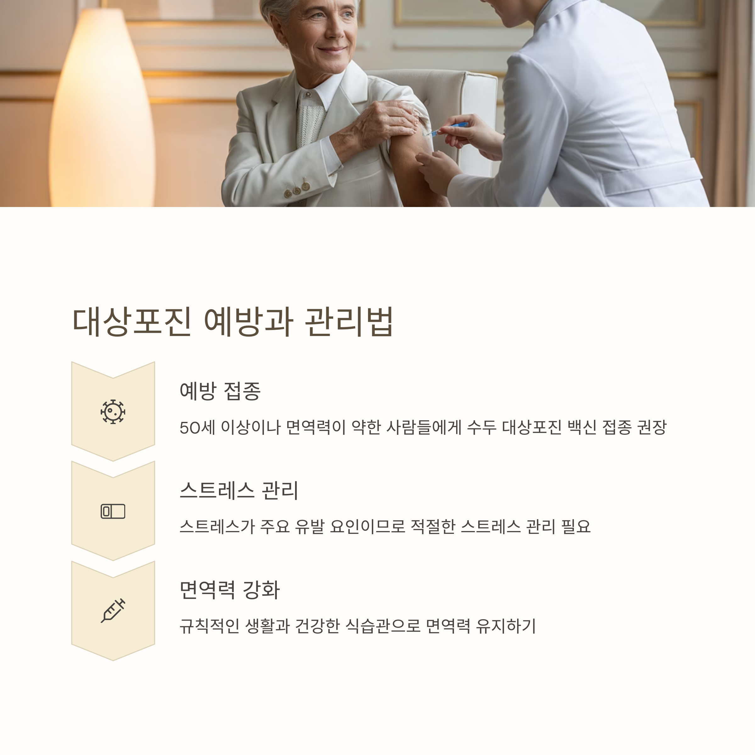 또한, 스트레스나 면역력 저하가 주요한 유발 요인인 만큼, 건강 관리와 스트레스 관리를 통해 대상포진 예방에 도움이 될 수 있습니다.