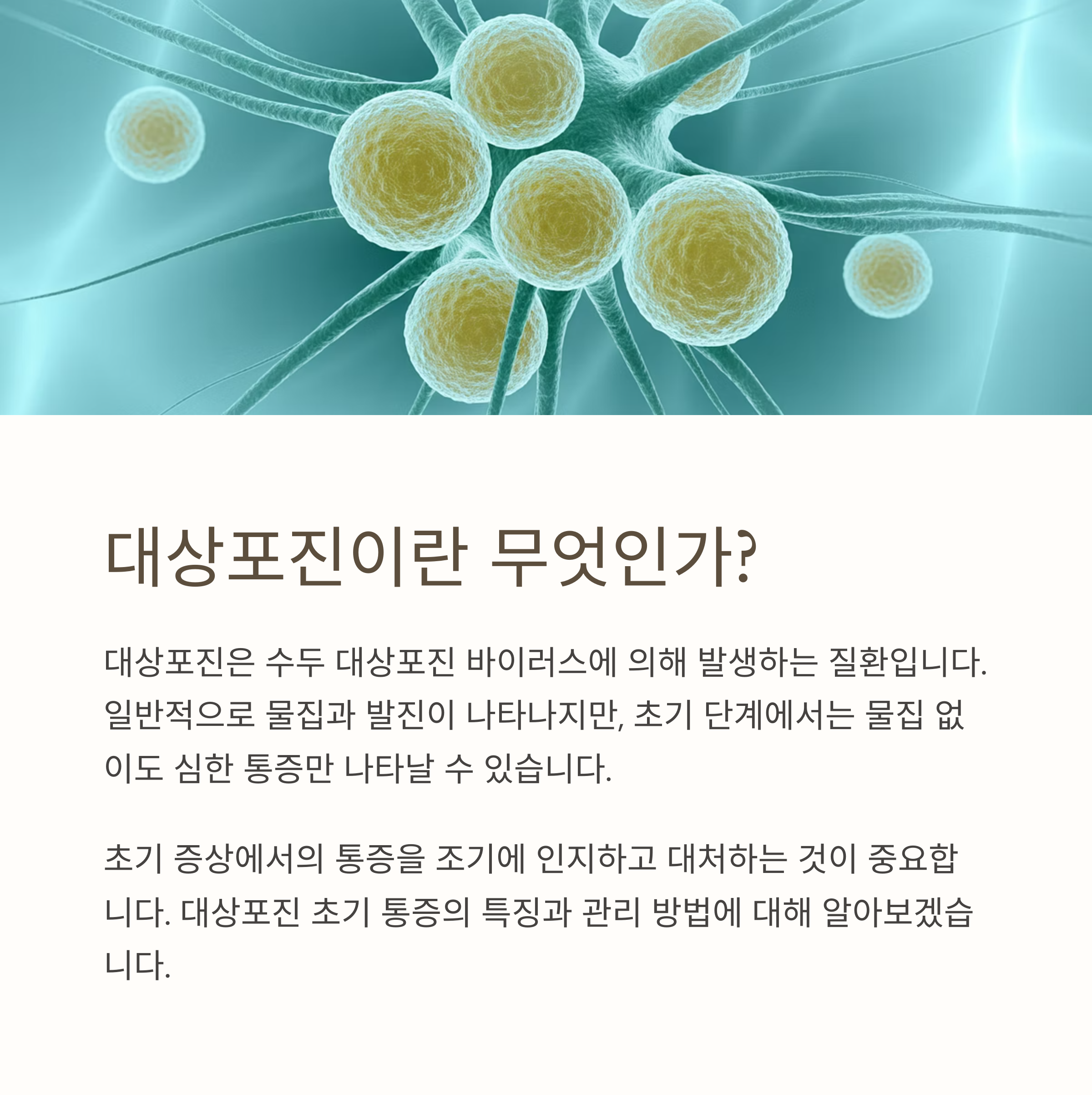 대상포진은 초기 통증만으로도 상당히 불편하고, 방치할 경우 후유증을 남길 수 있습니다. 따라서 물집이 생기지 않았더라도 통증을 느낀다면 바로 병원을 찾아 적절한 치료를 받는 것이 중요합니다. 초기 치료가 병의 진행을 막고, 후유증을 예방하는 가장 효과적인 방법입니다.