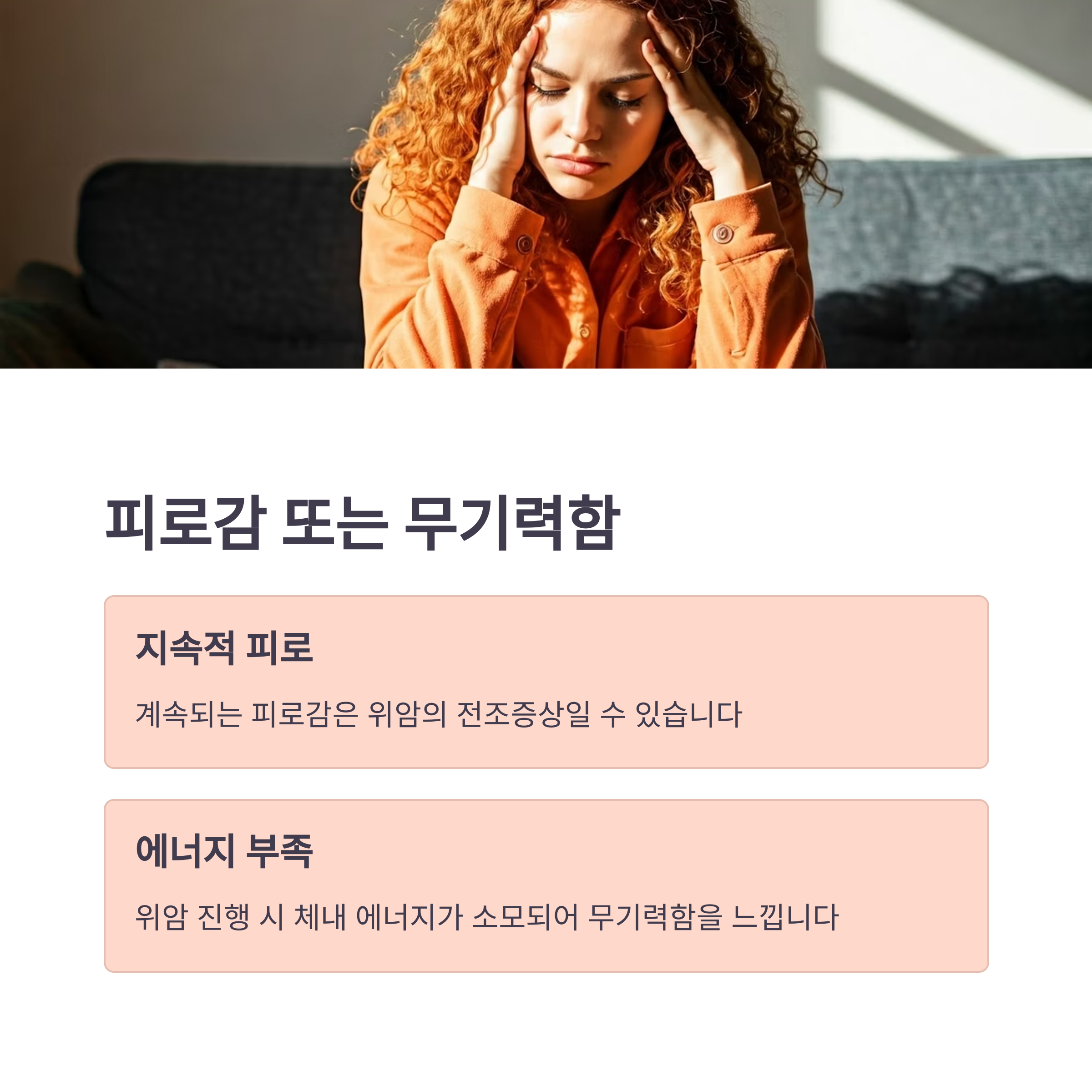 피로감이 지속적으로 느껴지고 평소보다 에너지가 부족한 느낌이 든다면, 이는 위암의 전조증상일 수 있습니다. 위암이 진행되면서 체내 에너지가 소모되기 때문입니다.