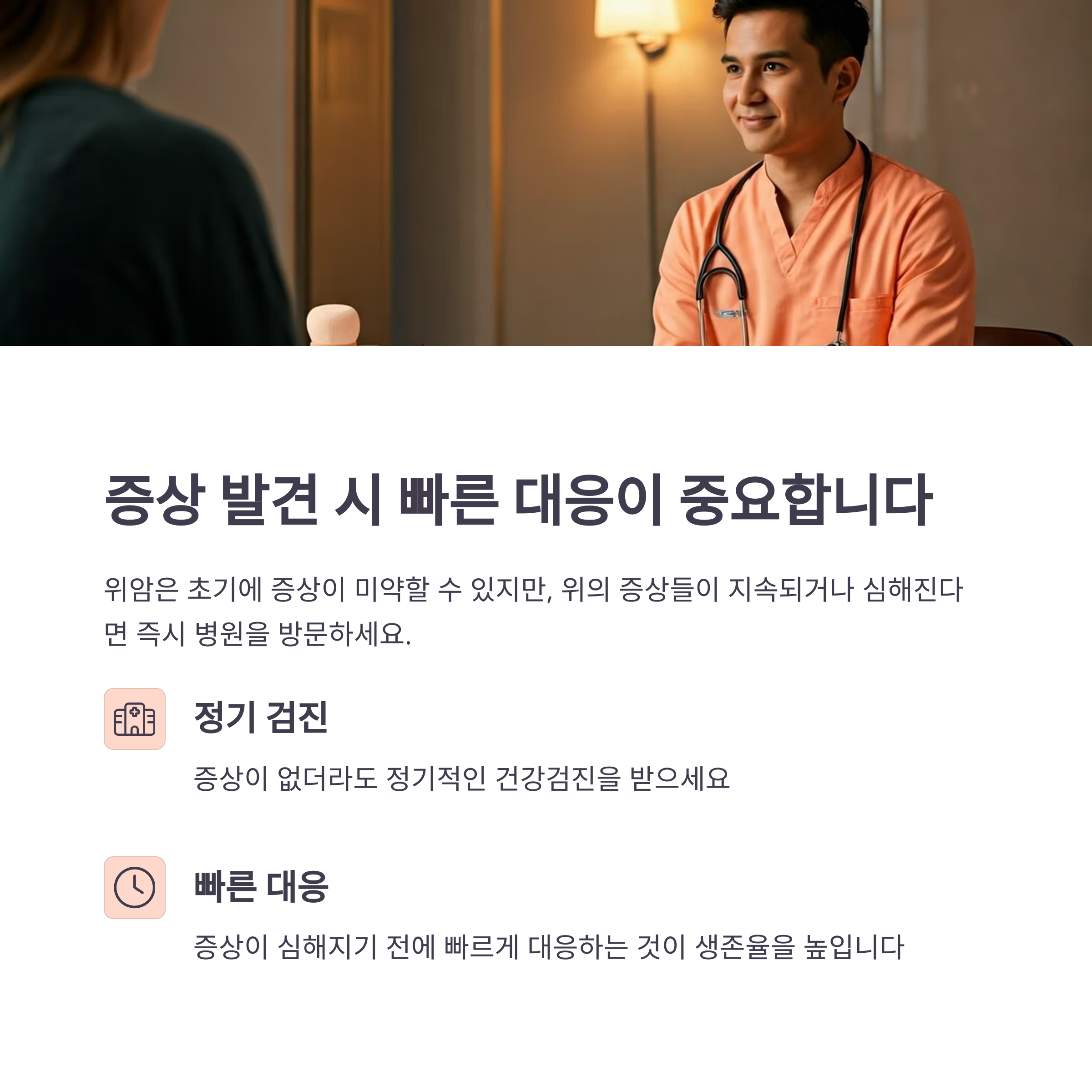 위암은 초기 증상이 미약하게 나타날 수 있지만, 증상이 심해지기 전에 빠르게 대응하는 것이 중요합니다. 위에서 언급한 전조증상에 해당하는 증상이 지속되거나 심해질 경우, 즉시 병원을 방문하여 검사를 받는 것이 필수적입니다.