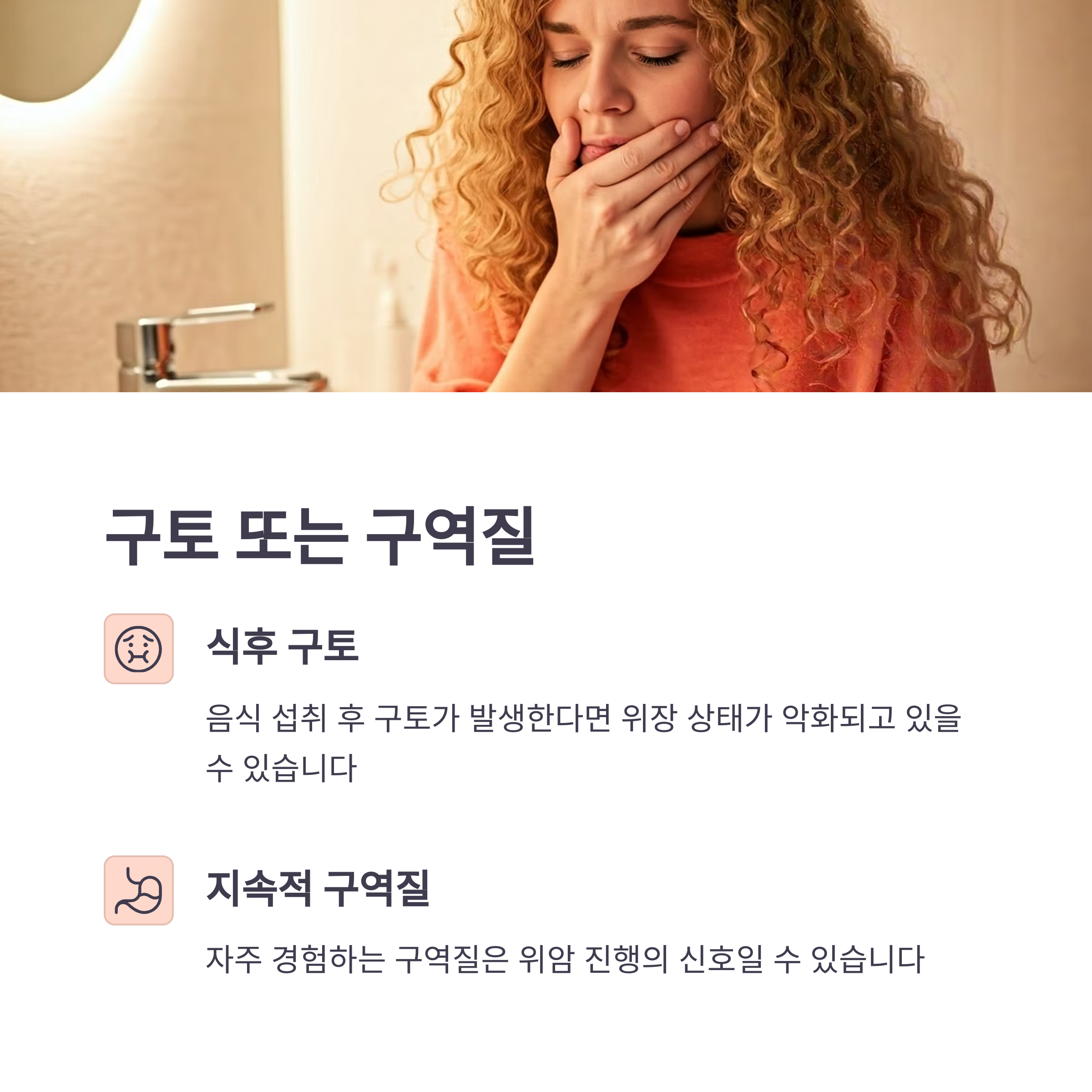 위암이 진행되면 구토나 구역질을 자주 경험할 수 있습니다. 특히 음식을 먹은 후에 구토가 일어난다면, 이는 위장의 상태가 악화되고 있다는 신호일 수 있습니다.