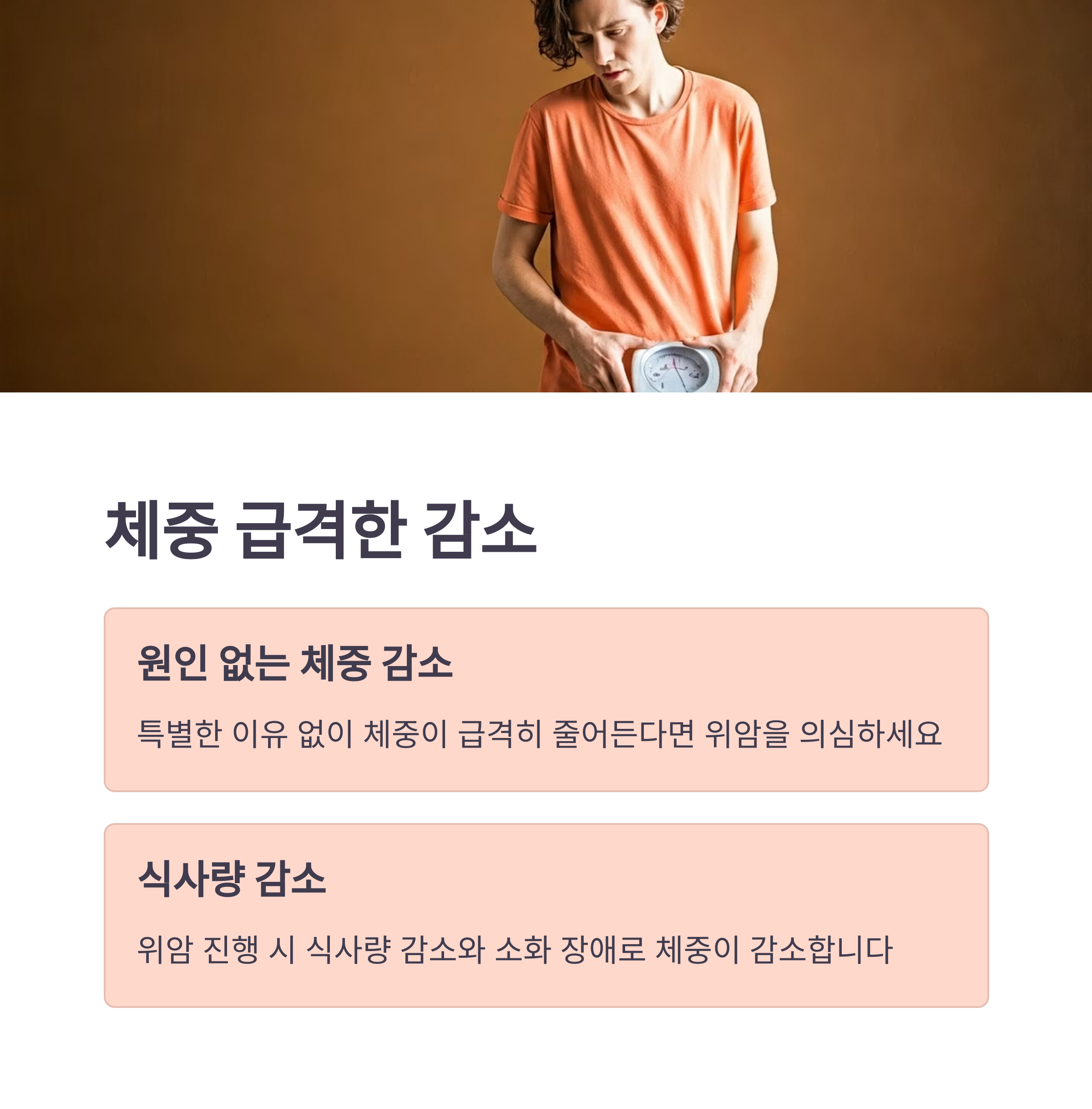 특별한 이유 없이 급격한 체중 감소가 일어난다면 위암을 의심할 수 있습니다. 위암이 진행되면서 식사량이 줄어들거나 소화가 어려워져 체중이 감소할 수 있습니다.