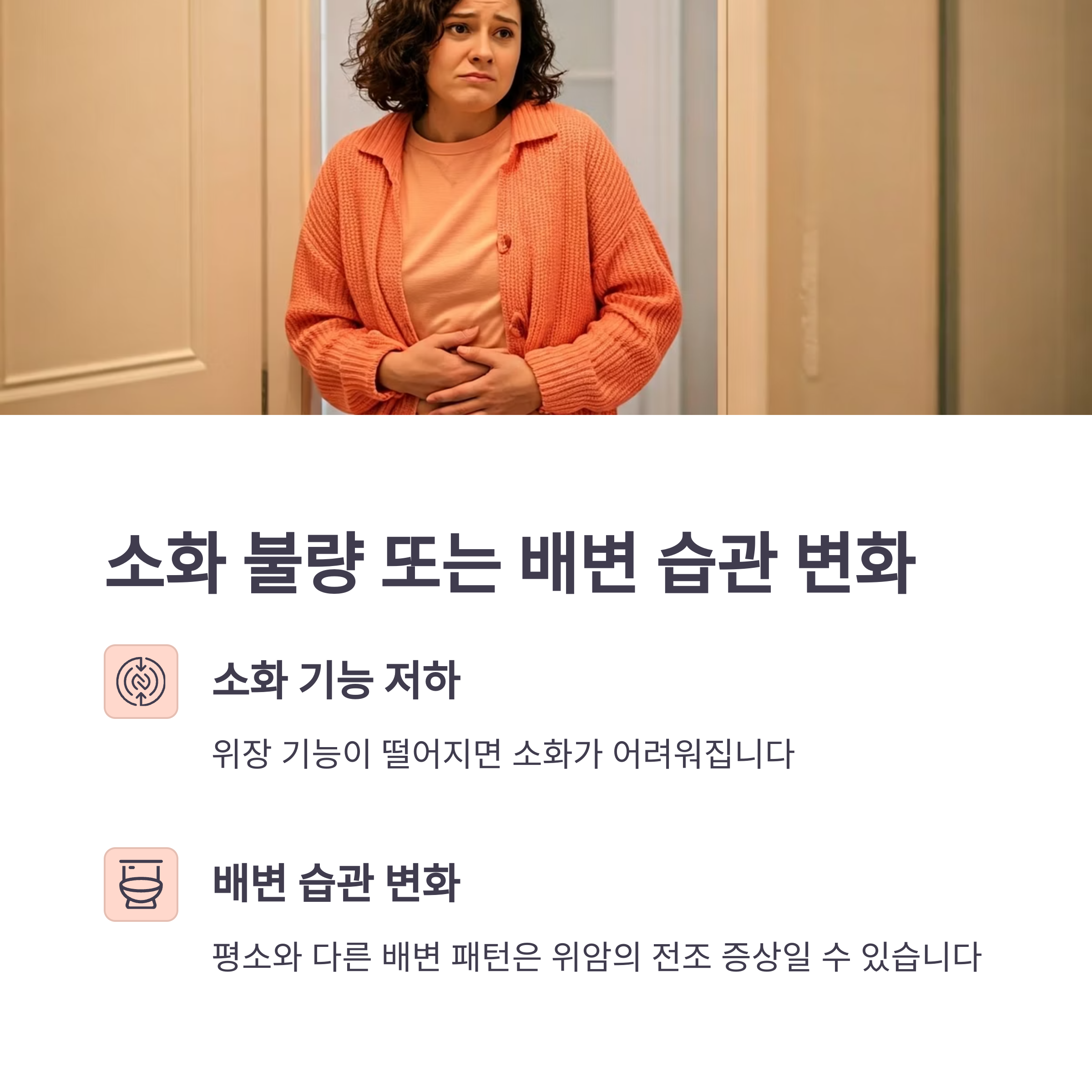 소화 불량이나 배변 습관의 변화도 위암의 전조 증상 중 하나입니다. 위장의 기능이 떨어지면 소화가 어려워지고, 배변 습관에도 영향을 줄 수 있습니다.