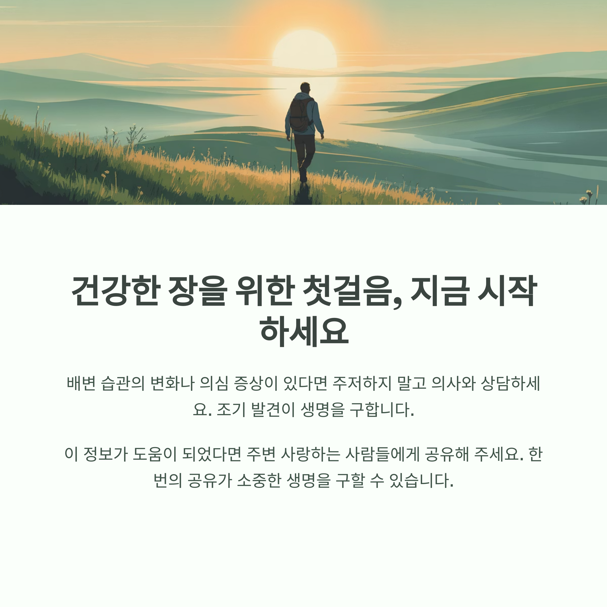 배변 습관 변화나 기타 의심되는 증상이 나타났다면, 대장내시경이나 CT 검사 등을 통해 정확한 진단을 받는 것이 중요합니다. 조기에 발견하면 치료 가능성이 높아지므로, 증상이 나타났을 때 빠르게 검사를 진행하는 것이 바람직합니다.