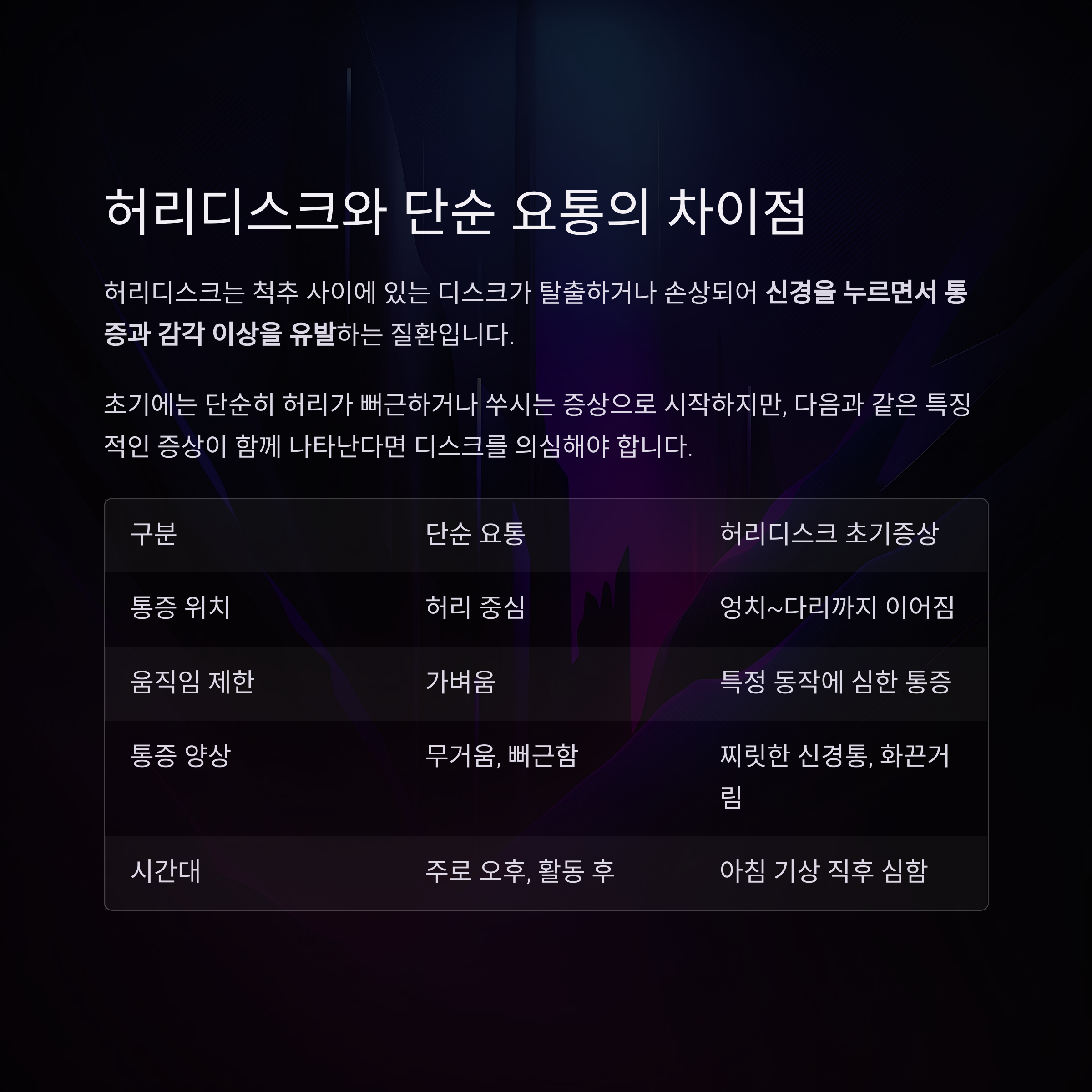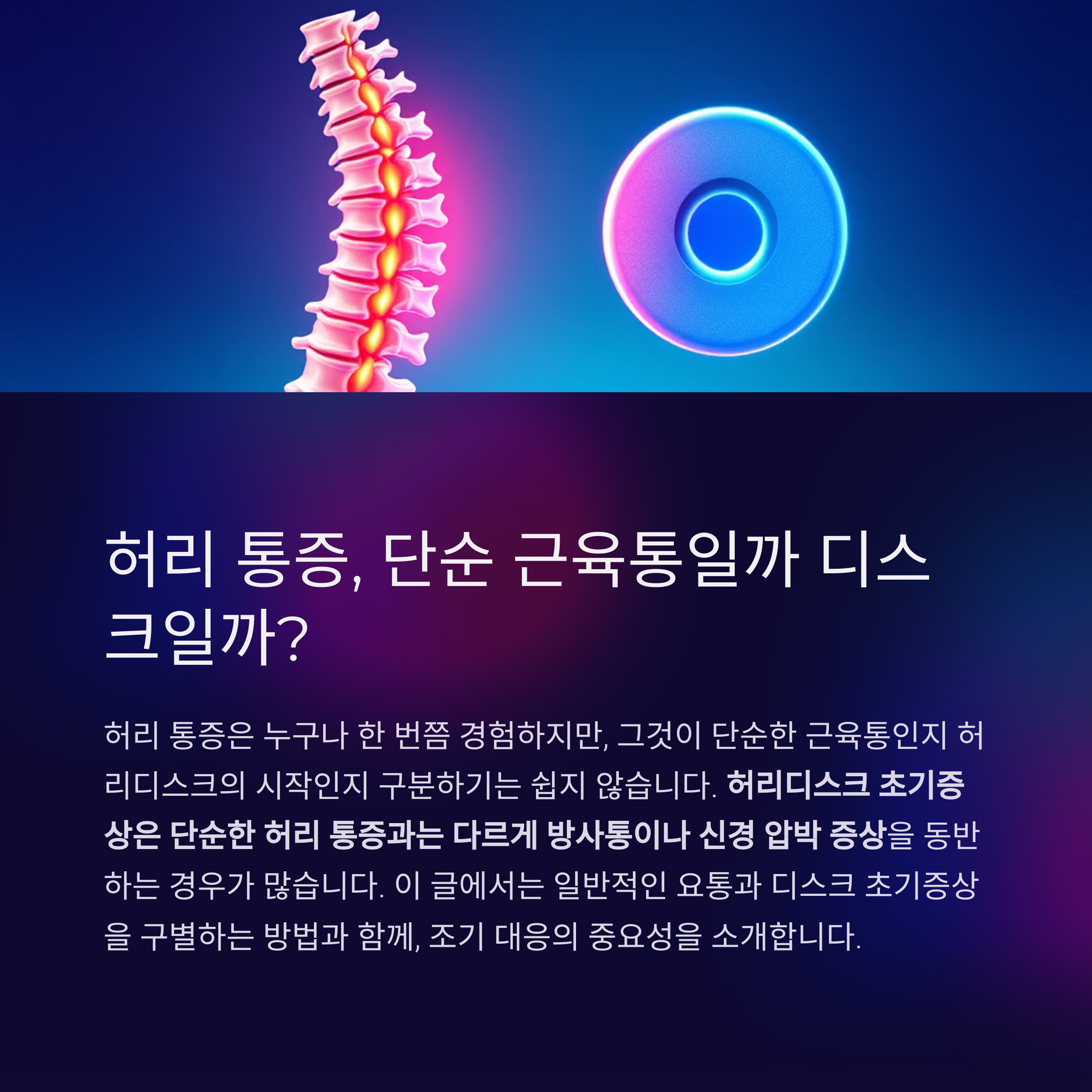 허리 통증은 누구나 한 번쯤 경험하지만, 그것이 단순한 근육통인지 허리디스크의 시작인지 구분하기는 쉽지 않습니다.