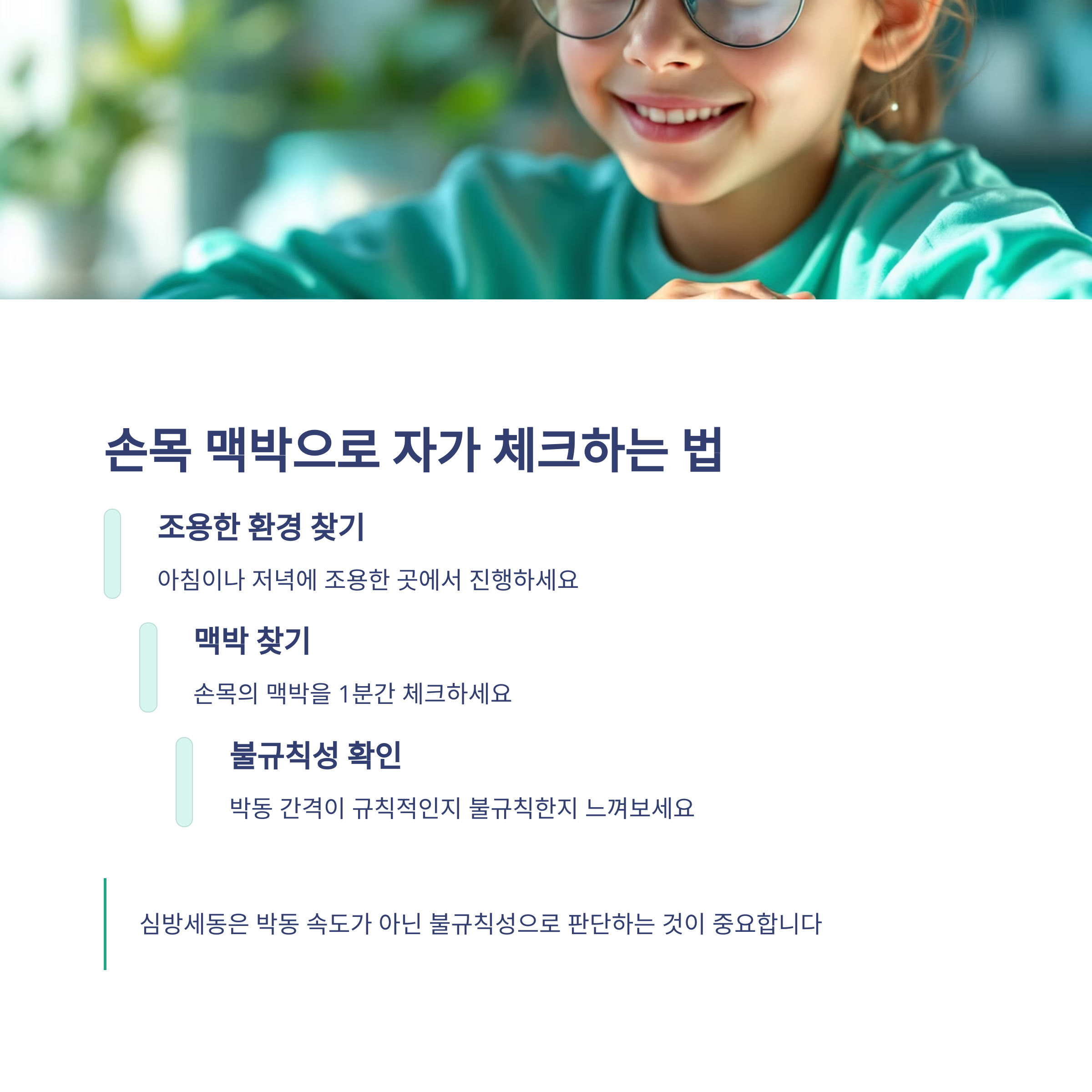 손목의 맥박을 1분간 체크하며 박동 간격이 규칙적인지 불규칙한지 느껴보는 것입니다.