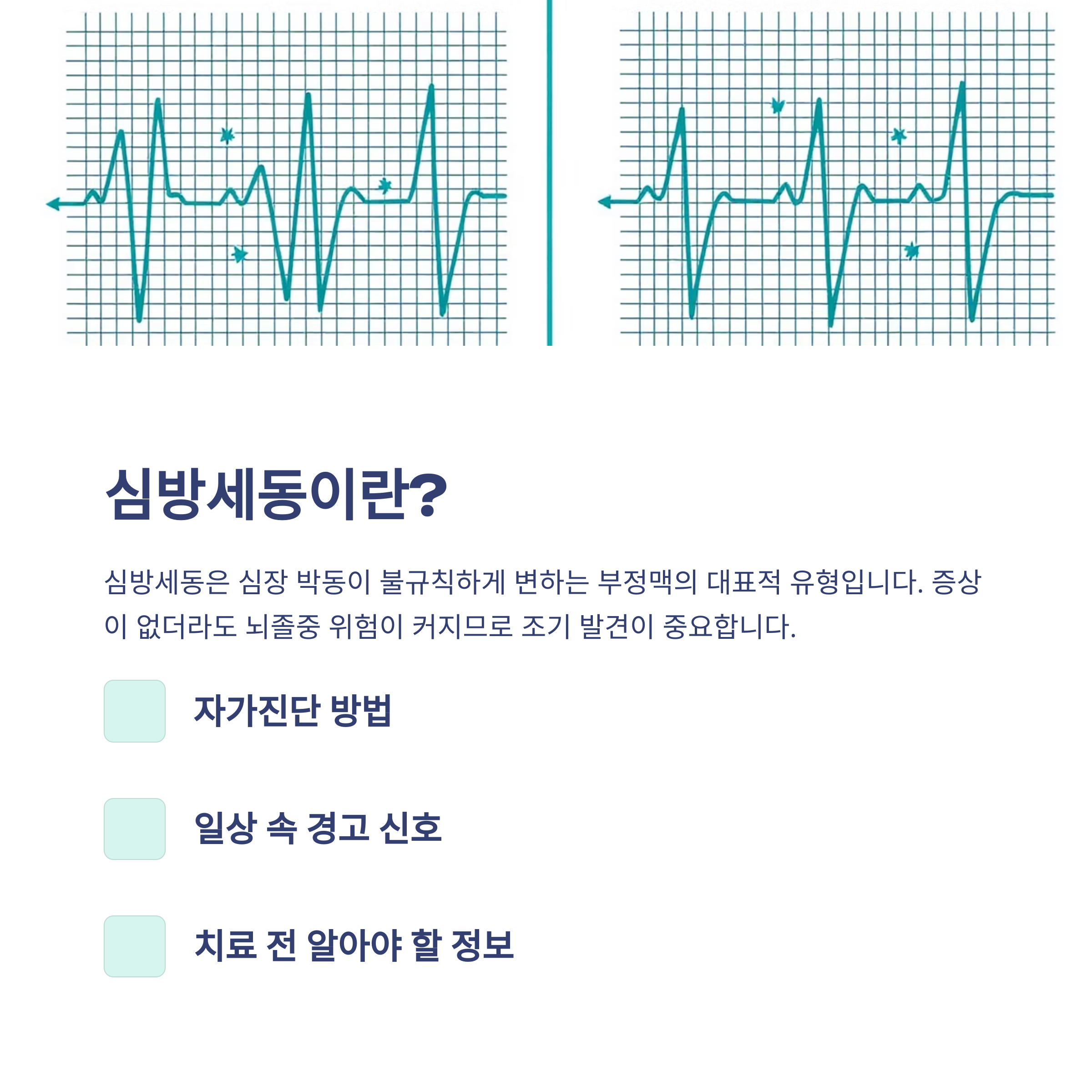 심방세동은 부정맥의 대표적인 유형으로 심장 박동이 불규칙하게 변하는 증상입니다.