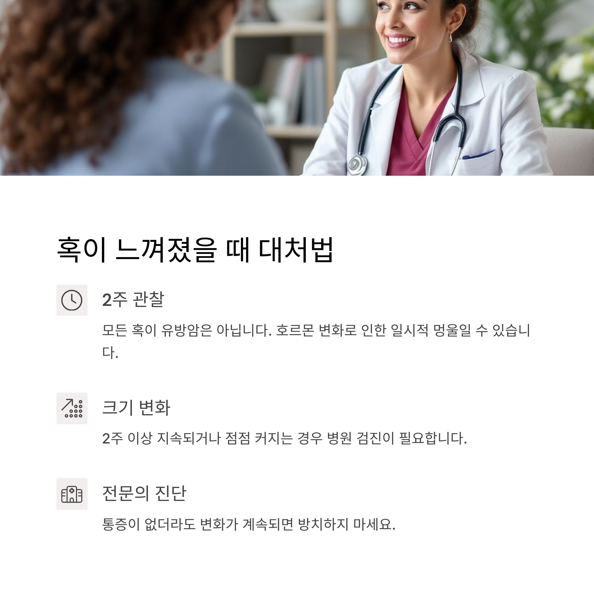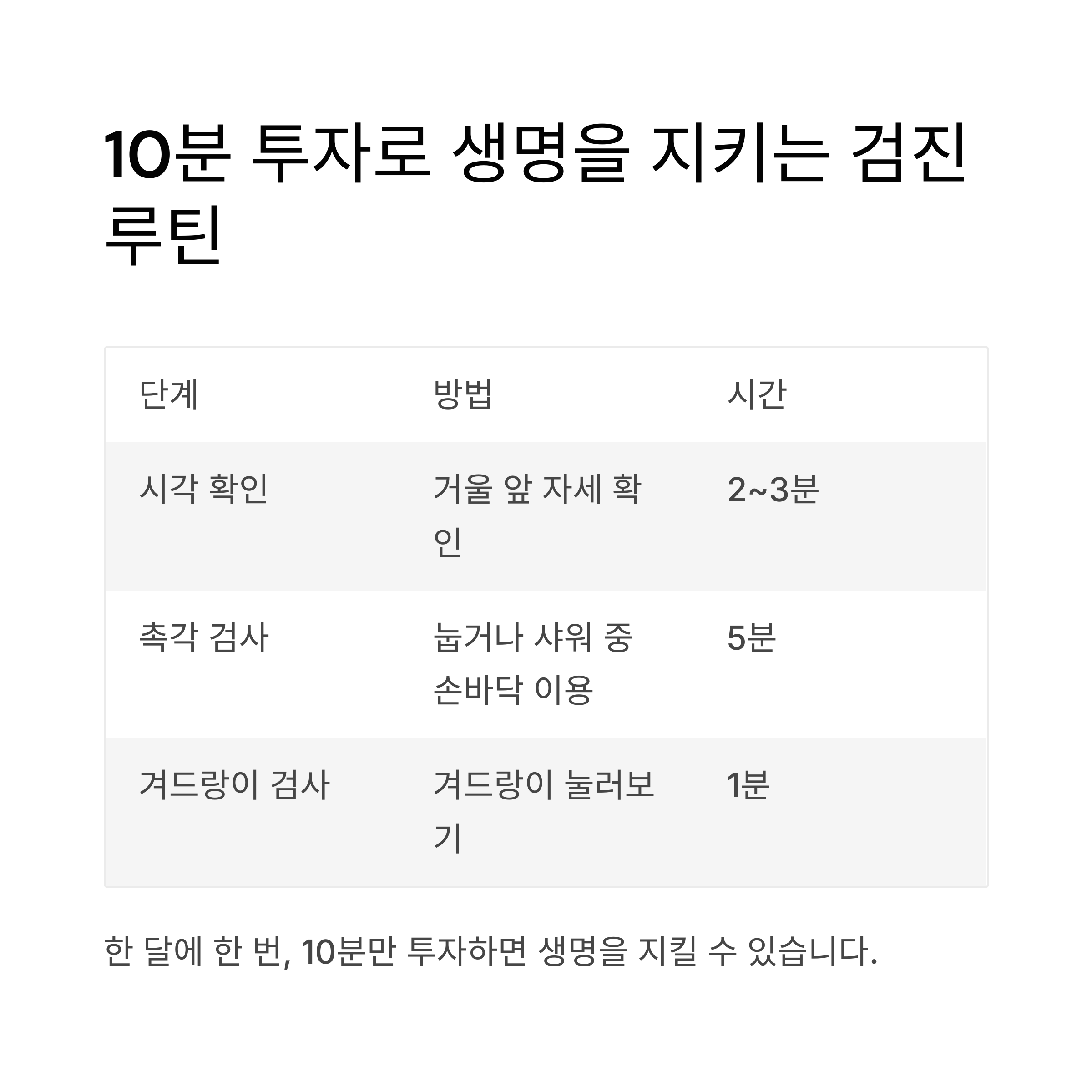 자가검진은 1차 감지 수단일 뿐, 확진과 예방은 병원 검진이 필수입니다.
