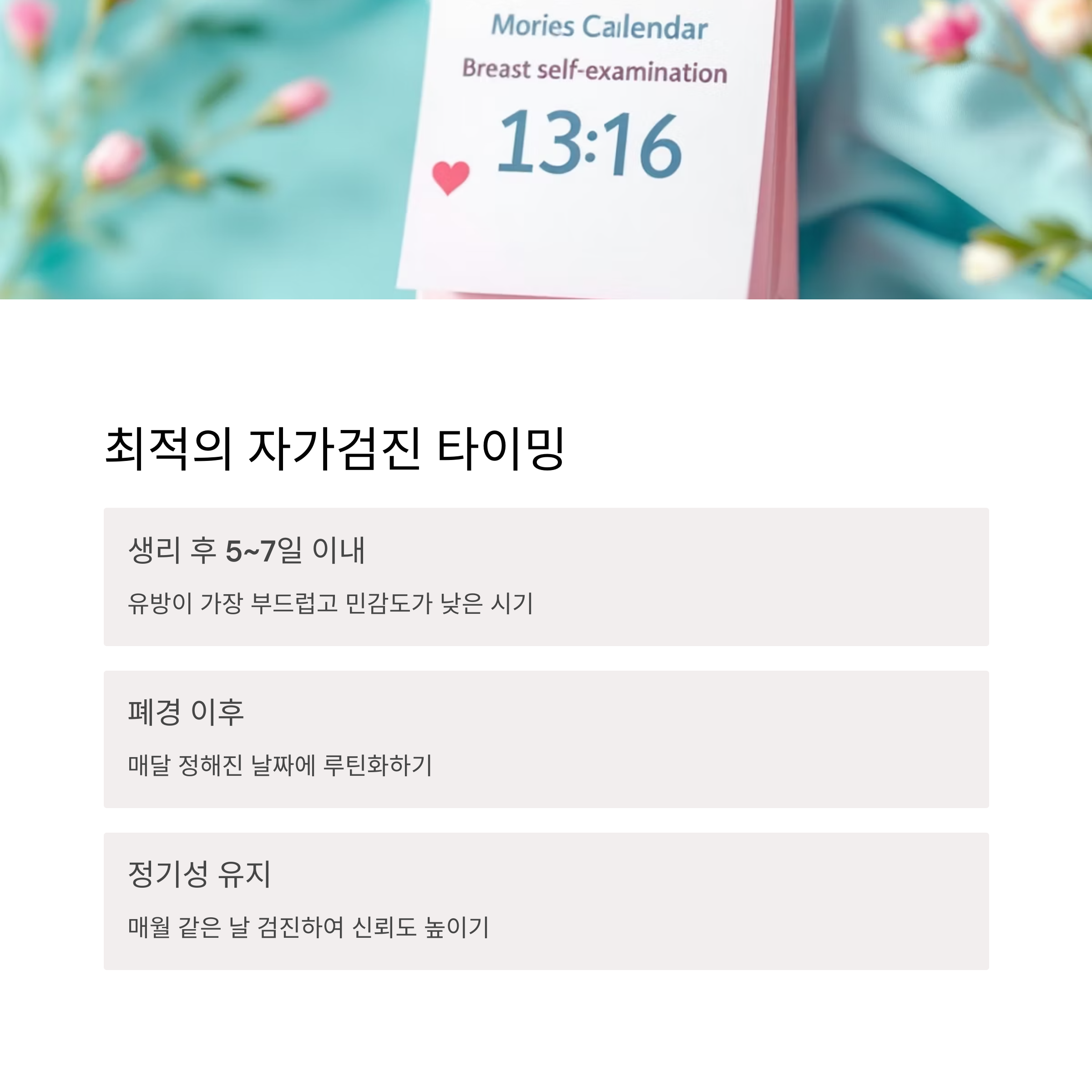 이 시기는 유방이 가장 부드럽고 민감도가 낮아져 검진 효과가 높습니다.