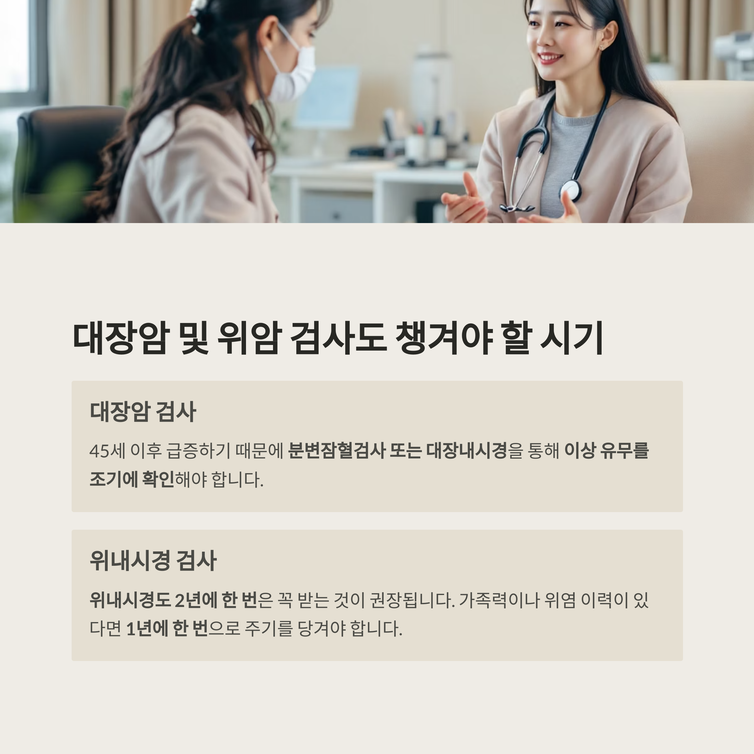 | 대장내시경/분변잠혈검사 | 2~5년 | 대장암 조기 진단 |