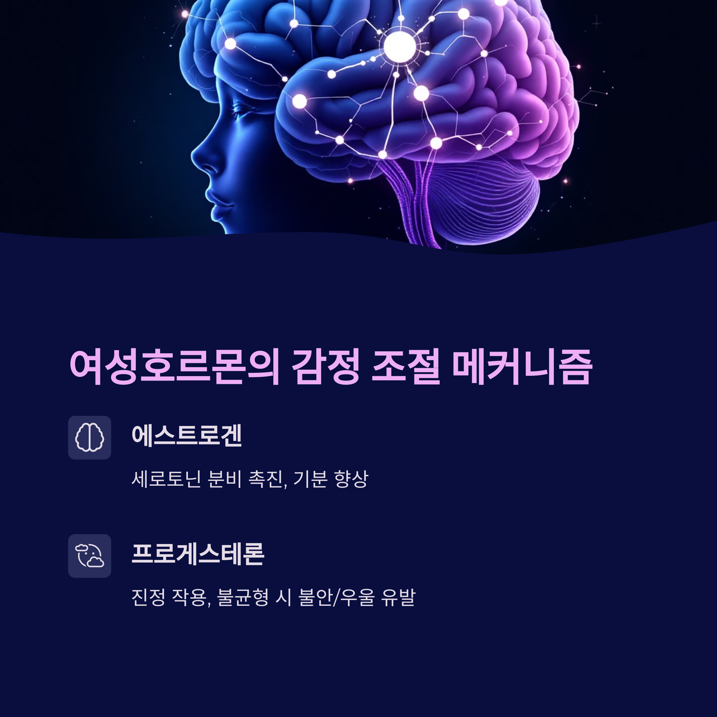 여성의 주요 성호르몬인 에스트로겐과 프로게스테론은 중추신경계에 직접 작용하여 감정 조절에 관여합니다.