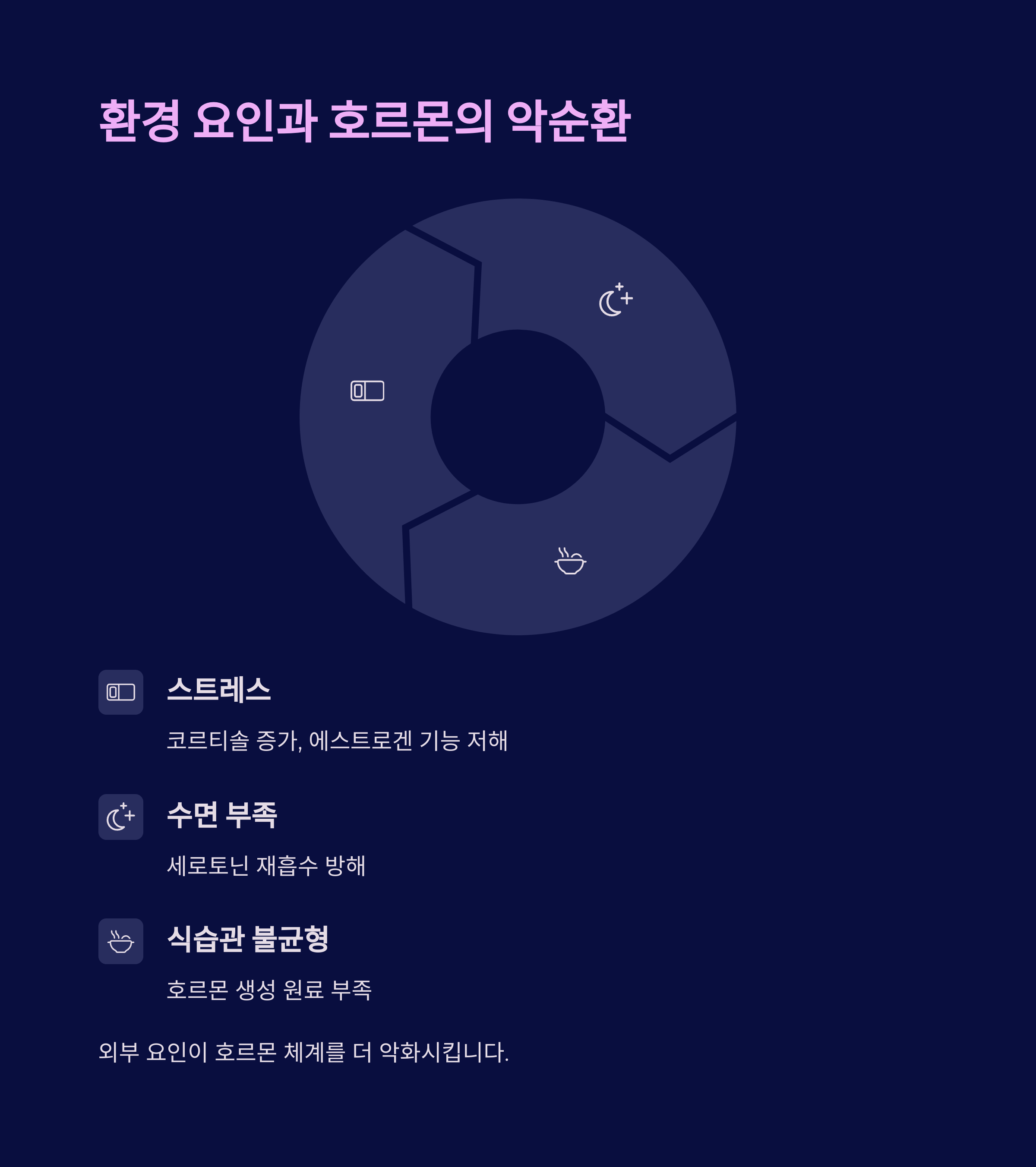 과도한 스트레스, 수면 부족, 식습관 불균형은 호르몬 체계를 더 악화시키는 외부 요인입니다.