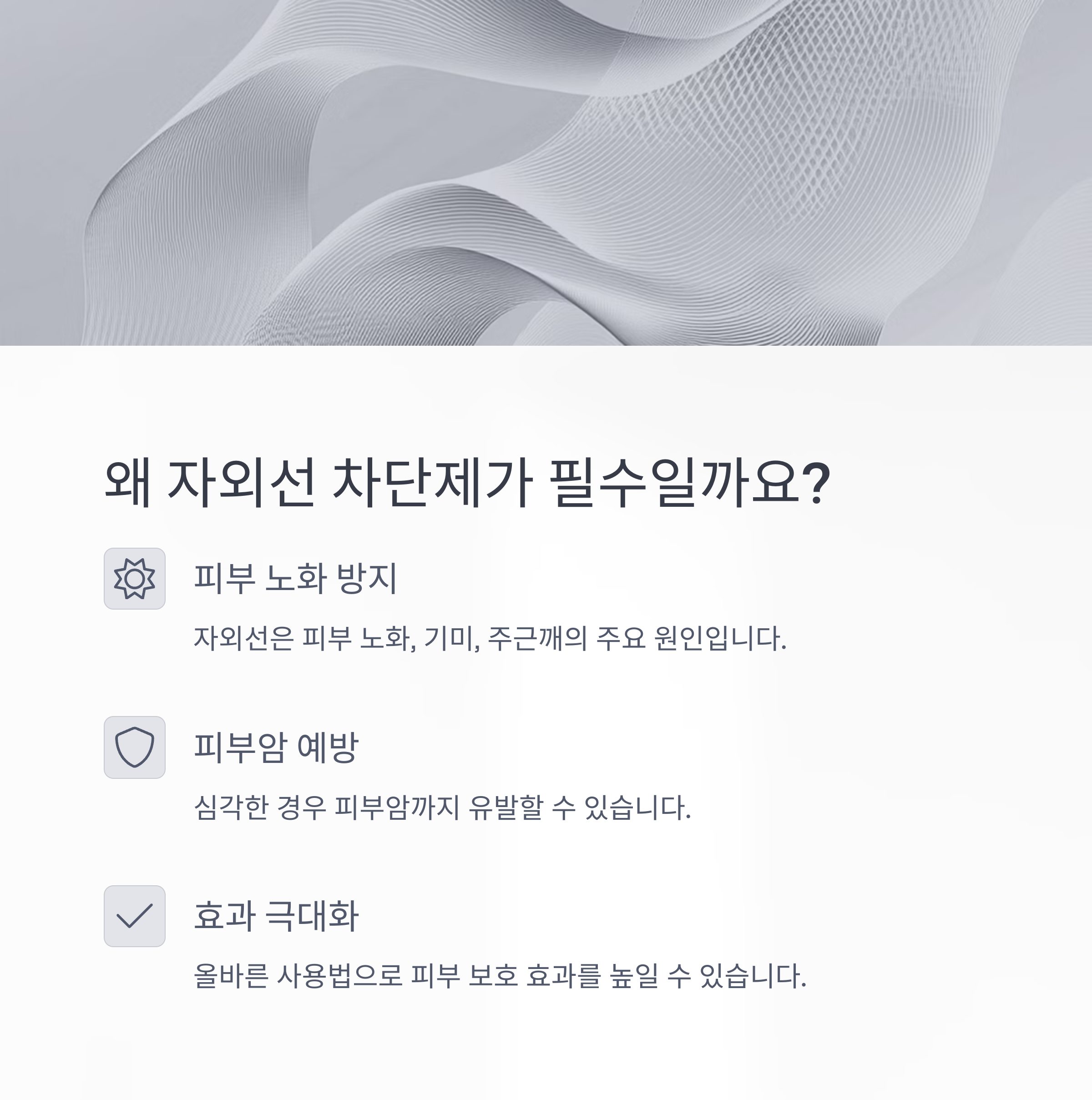 자외선은 피부 노화, 기미, 주근깨, 심지어 피부암까지 유발하는 주요 원인이기 때문입니다.
