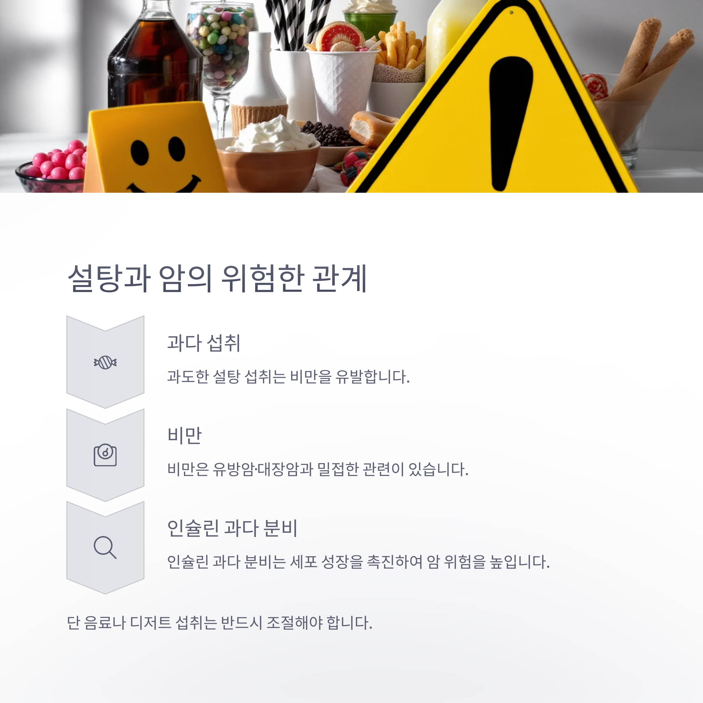 과도한 설탕 섭취는 비만을 유발하고, 이는 유방암·대장암과 밀접한 관련이 있습니다.