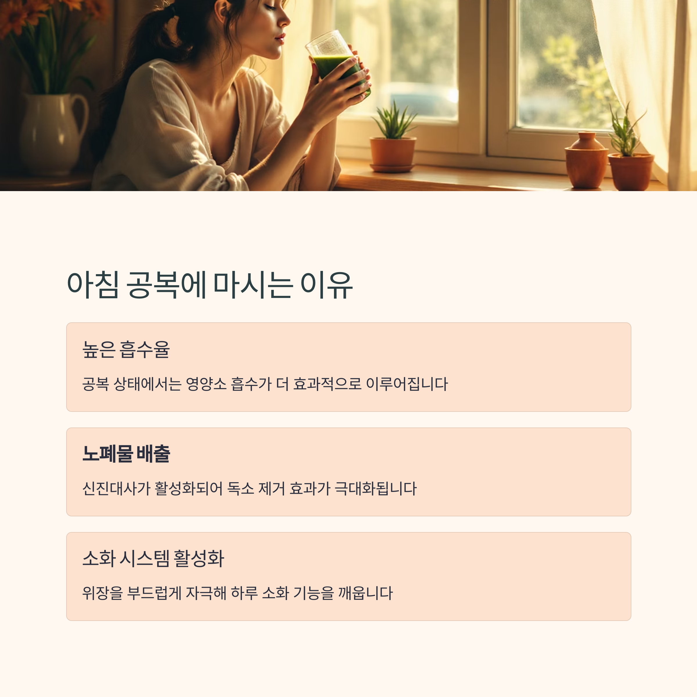 | 해독 주스 섭취 | 오전 7~9시 | 노폐물 배출, 신진대사 촉진 |