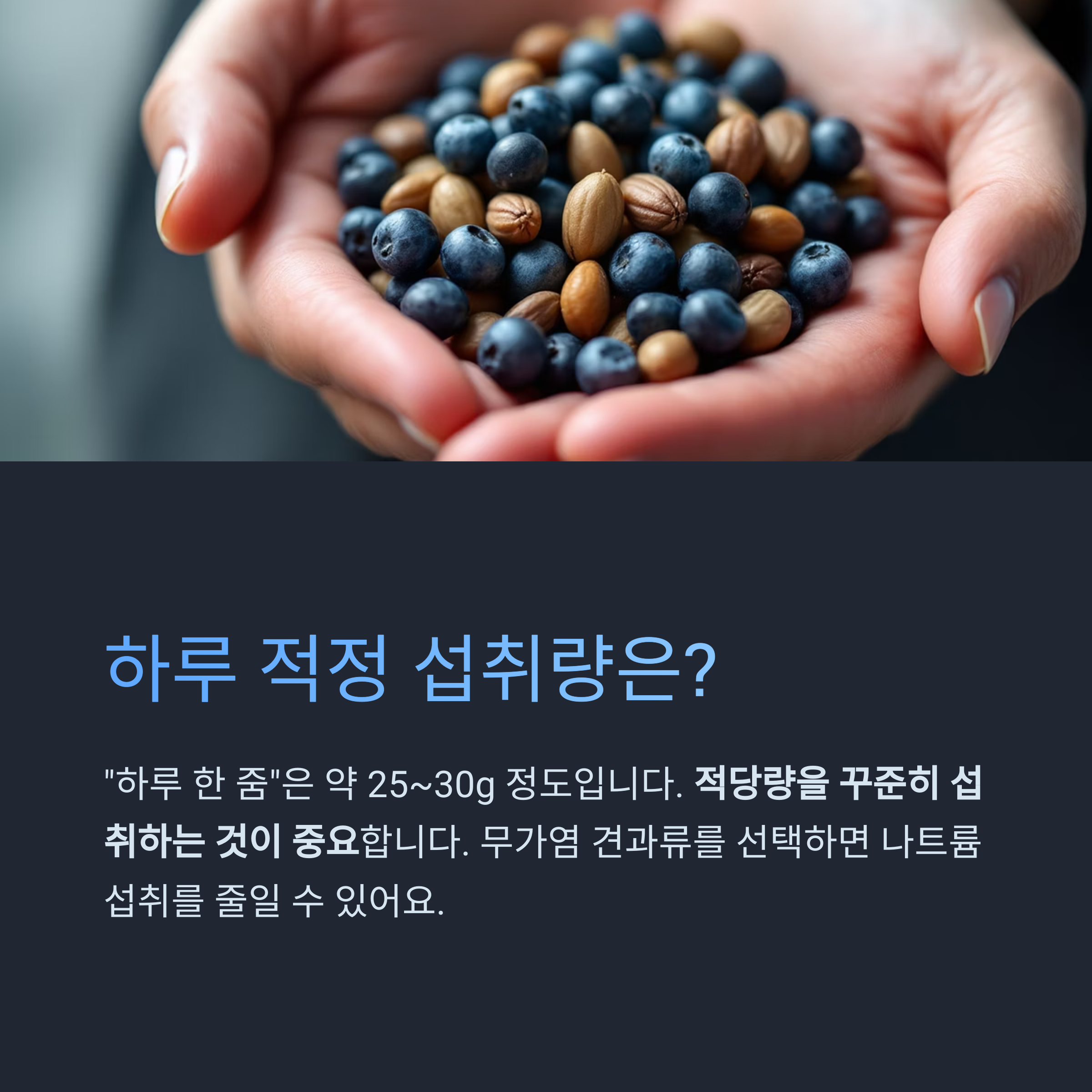 특히 무가염 견과류를 선택하는 것이 나트륨 섭취를 줄이는 데 도움이 됩니다.