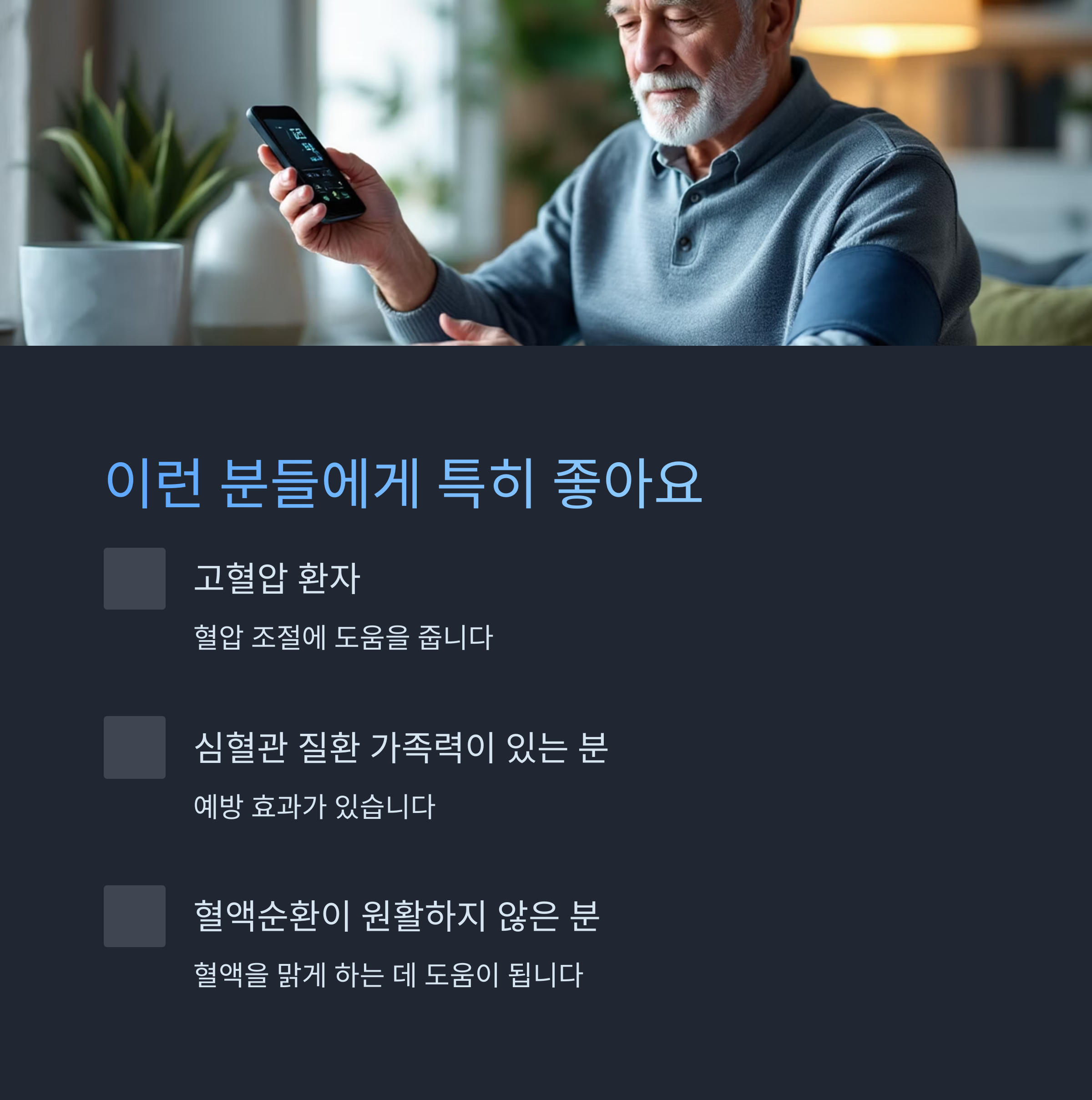 또한 체내 염증 수치가 높은 분, 혈액순환이 원활하지 못한 분에게도 효과적입니다.