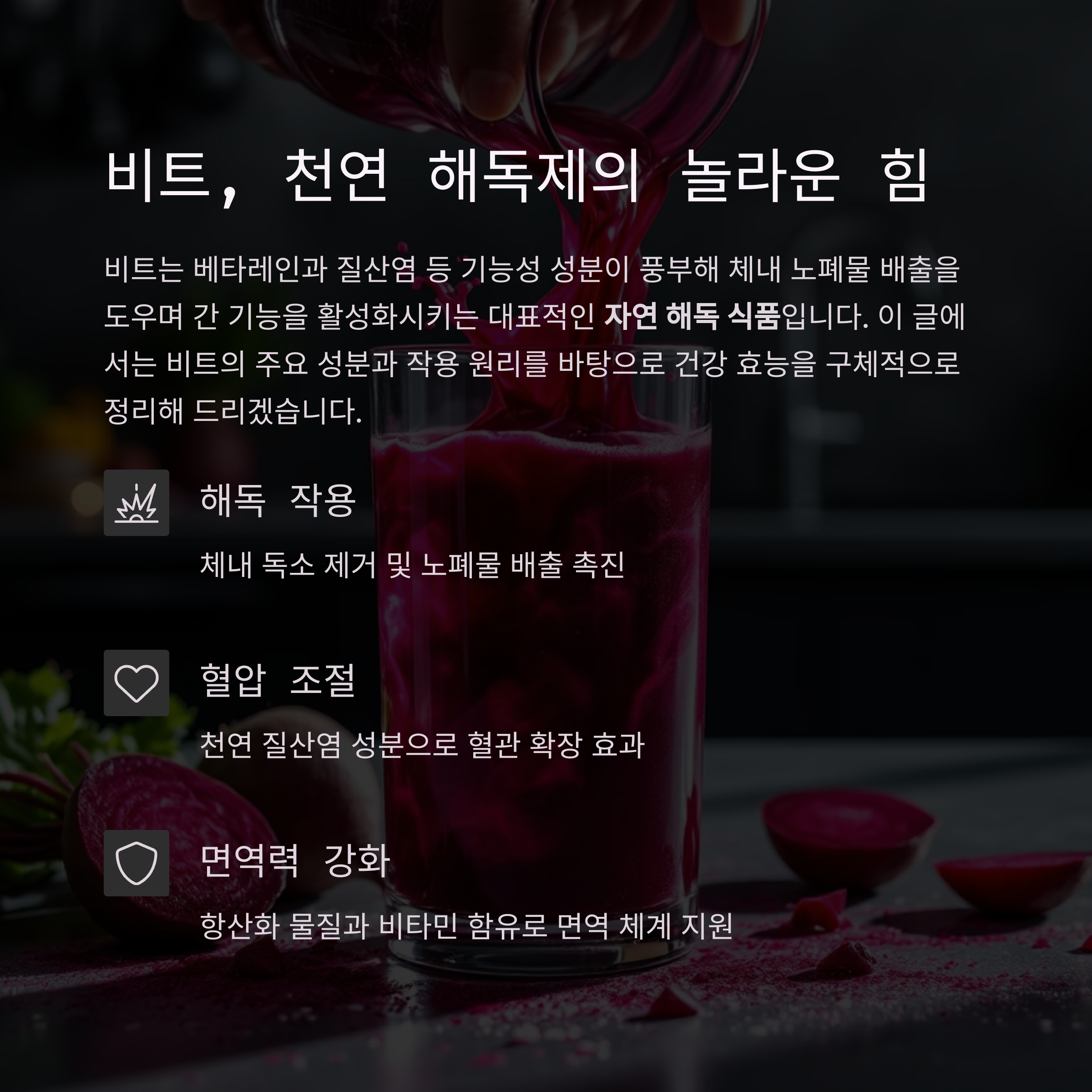 비트는 간세포 재생과 해독 작용을 촉진해 간 기능을 개선하는 데 중요한 역할을 합니다.