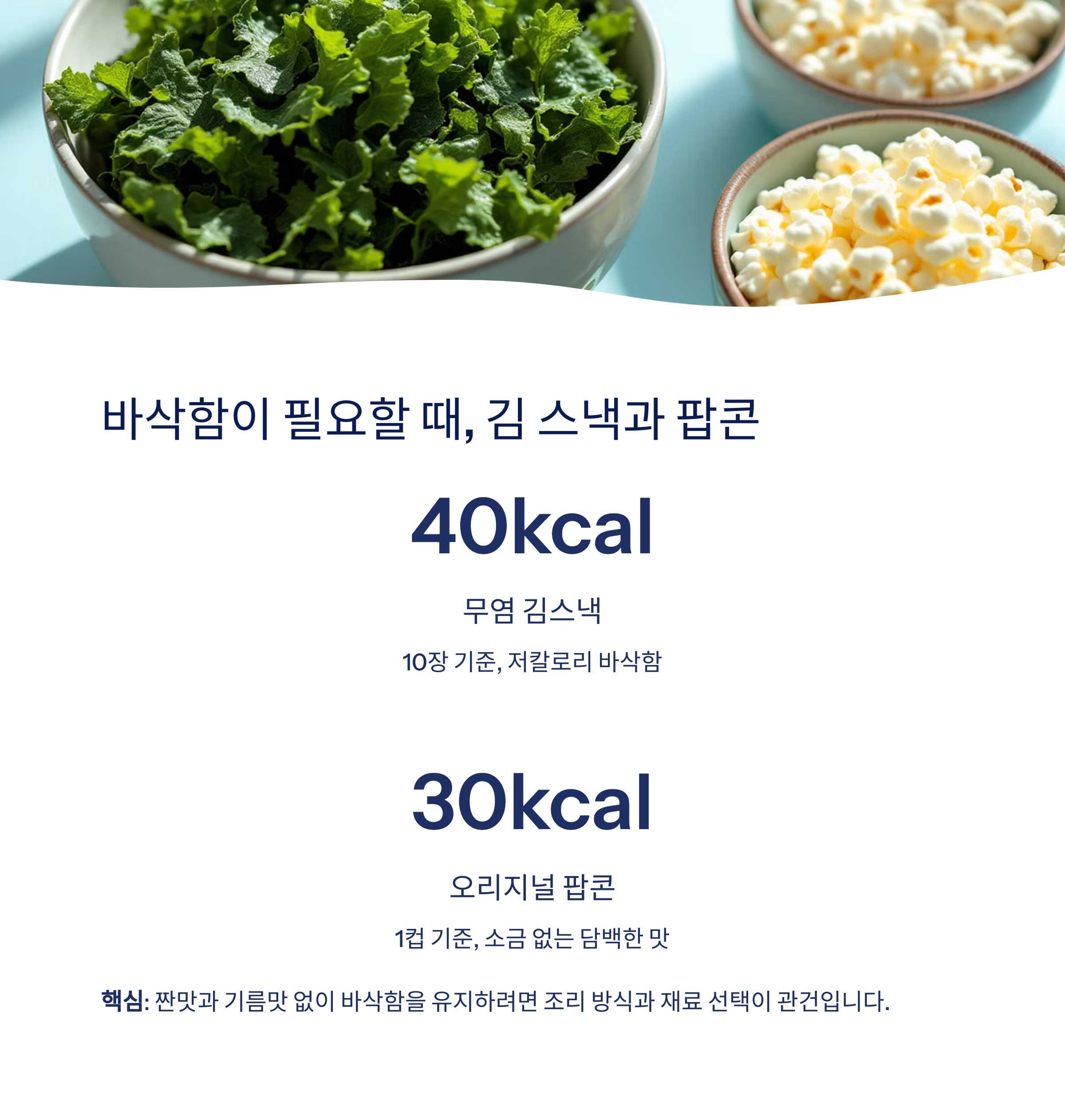 튀긴 과자 대신 조미되지 않은 김이나 공기팝팝콘을 선택하면 부담 없이 바삭함을 즐길 수 있습니다.