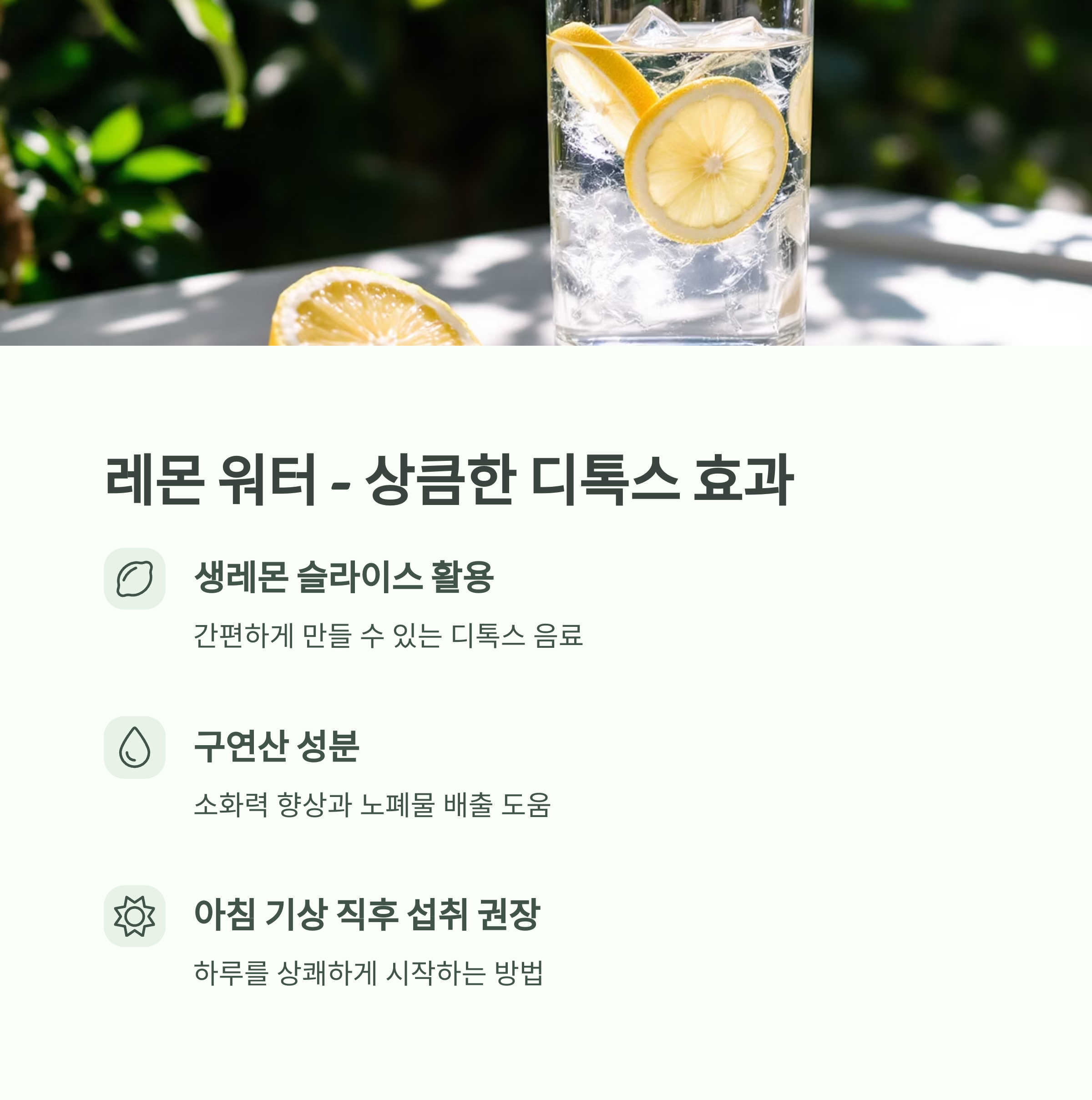 | 레몬 워터 | 기상 직후 | 해독, 식욕 조절 |